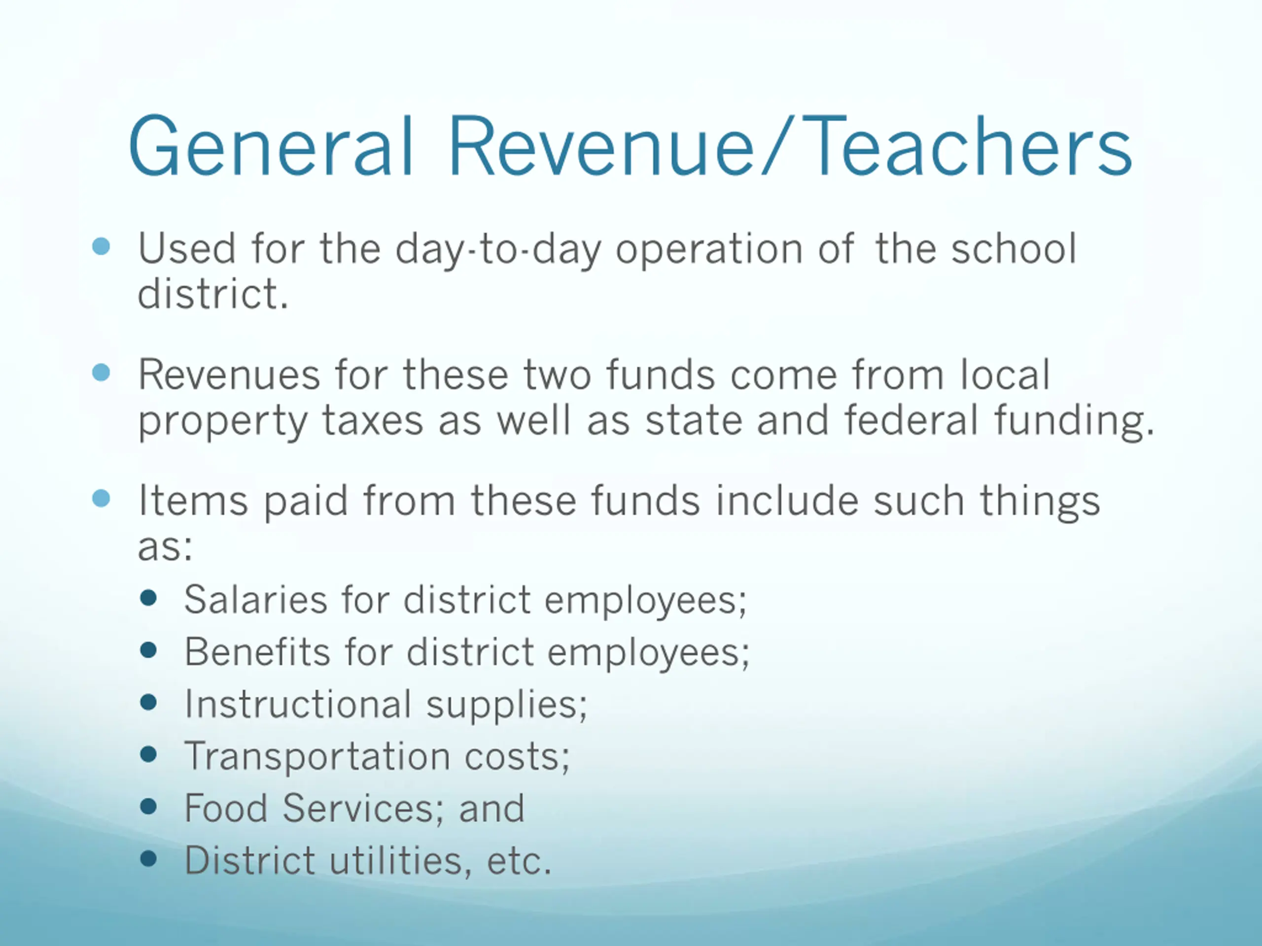 General Revenue/Teachers Used for the day-to-day operation of the school district. Revenues for these two funds come from local property taxes as well as state and federal funding. Items paid from these funds include such things as: Salaries for district employees; Benefits for district employees; Instructional supplies; Transportation costs; Food Services; and District utilities, etc.