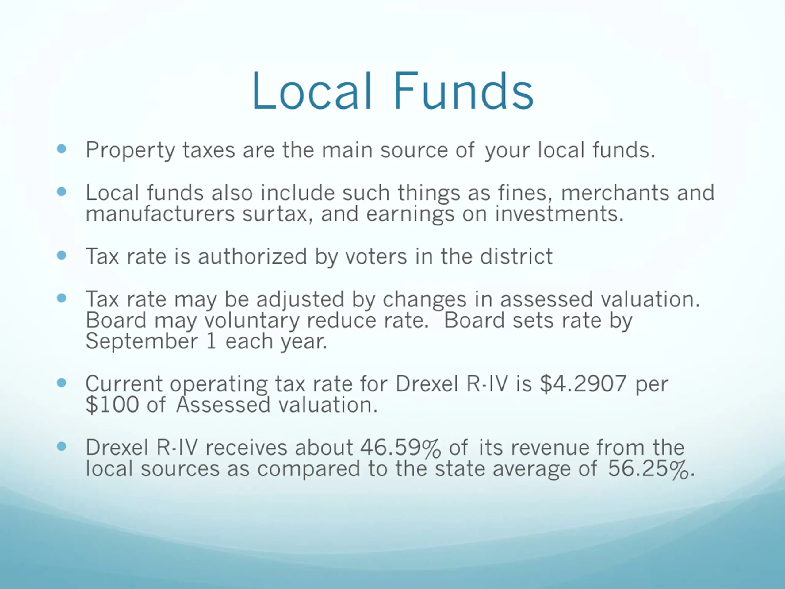 Local Funds Property taxes are the main source of your local funds. Local funds also include such things as fines, merchants and manufacturers surtax, and earnings on investments. Tax rate is authorized by voters in the district Tax rate may be adjusted by changes in assessed valuation. Board may voluntary reduce rate. Board sets rate by September 1 each year. Current operating tax rate for Drexel R-IV is $4.2907 per $100 of Assessed valuation. Drexel R-IV receives about 46.59% of its revenue from the local sources as compared to the state average of 56.25%.