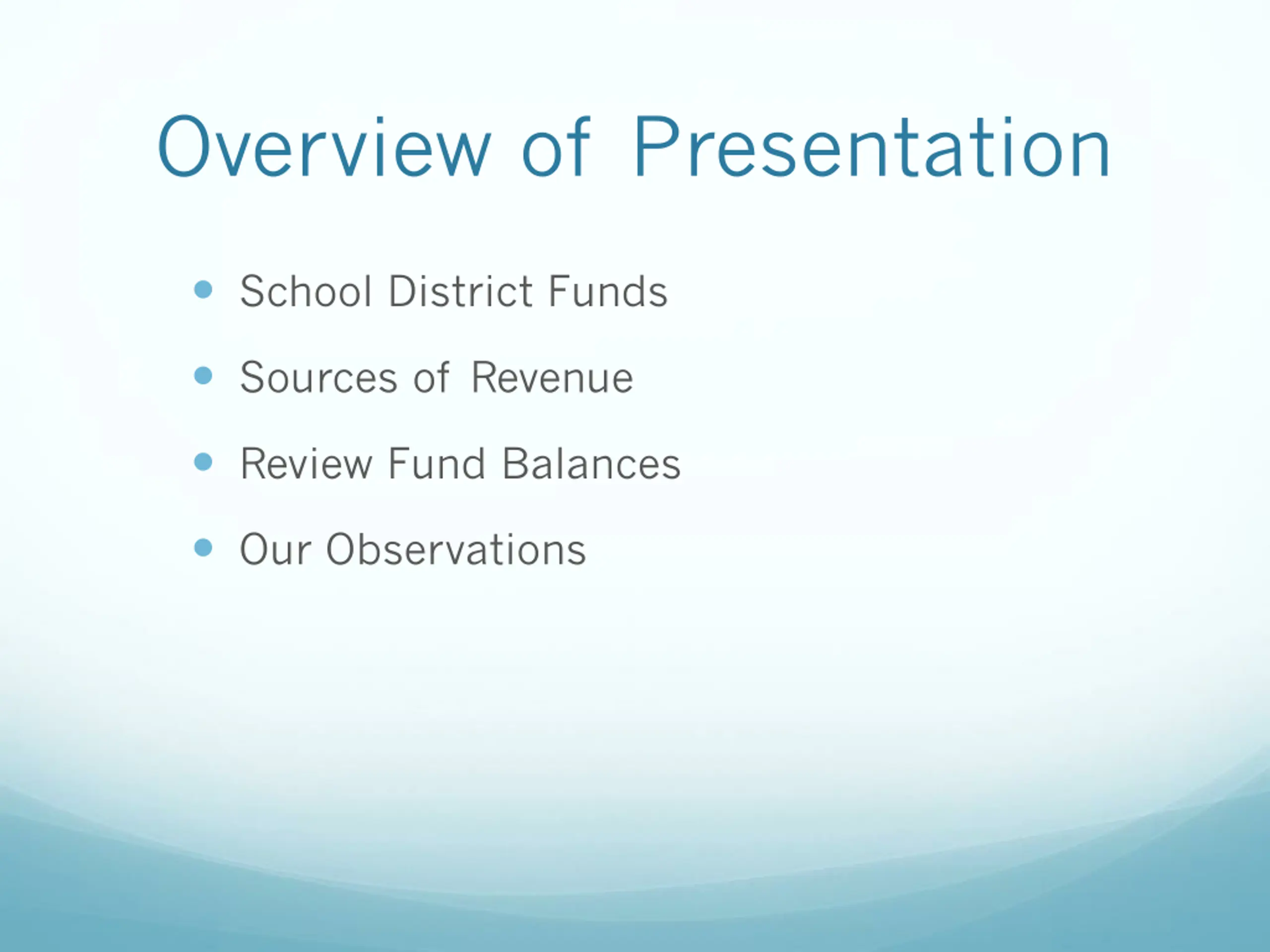 Overview of Presentation School District Funds Sources of Revenue Review Fund Balances Our Observations