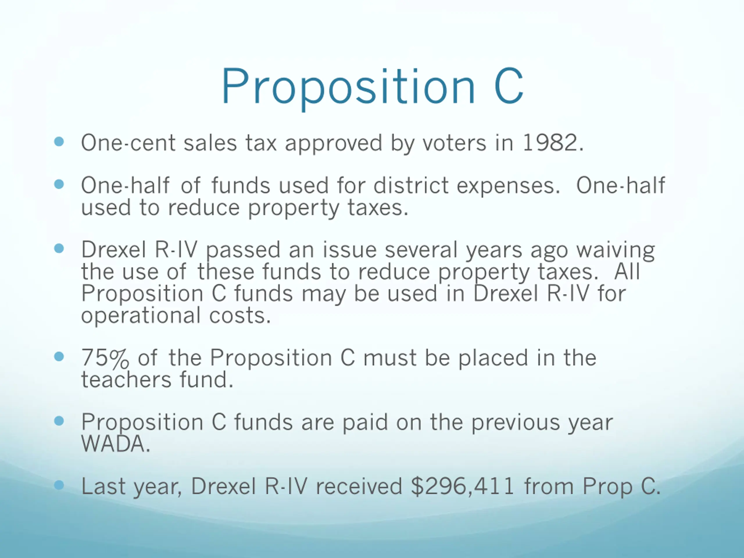 Proposition C One-cent sales tax approved by voters in 1982. One-half of funds used for district expenses. One-half used to reduce property taxes. Drexel R-IV passed an issue several years ago waiving the use of these funds to reduce property taxes. All Proposition C funds may be used in Drexel R-IV for operational costs. 75% of the Proposition C must be placed in the teachers fund. Proposition C funds are paid on the previous year WADA. Last year, Drexel R-IV received $296,411 from Prop C.