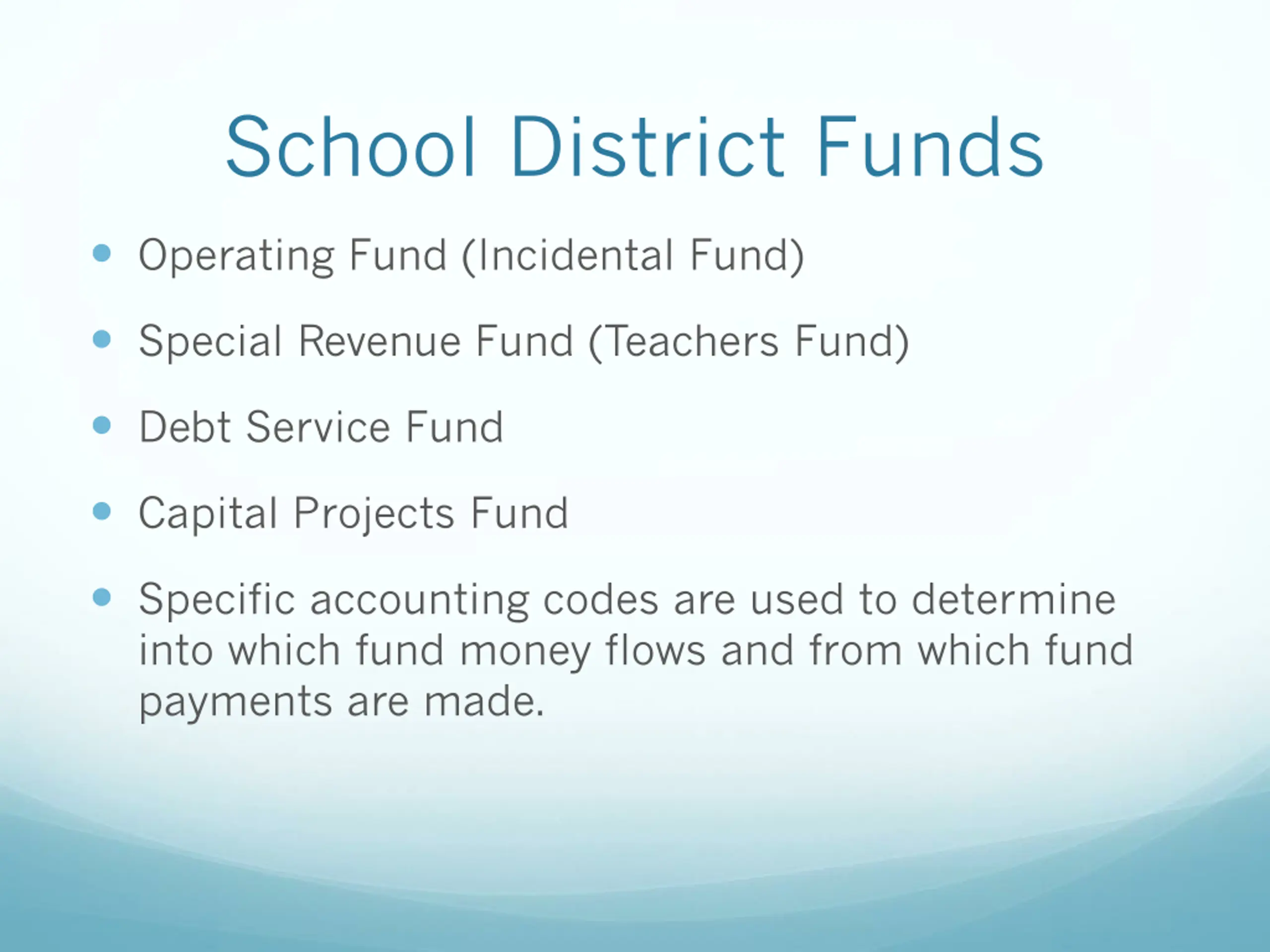 School District Funds Operating Fund (Incidental Fund) Special Revenue Fund (Teachers Fund) Debt Service Fund Capital Projects Fund Specific accounting codes are used to determine into which fund money flows and from which fund payments are made.