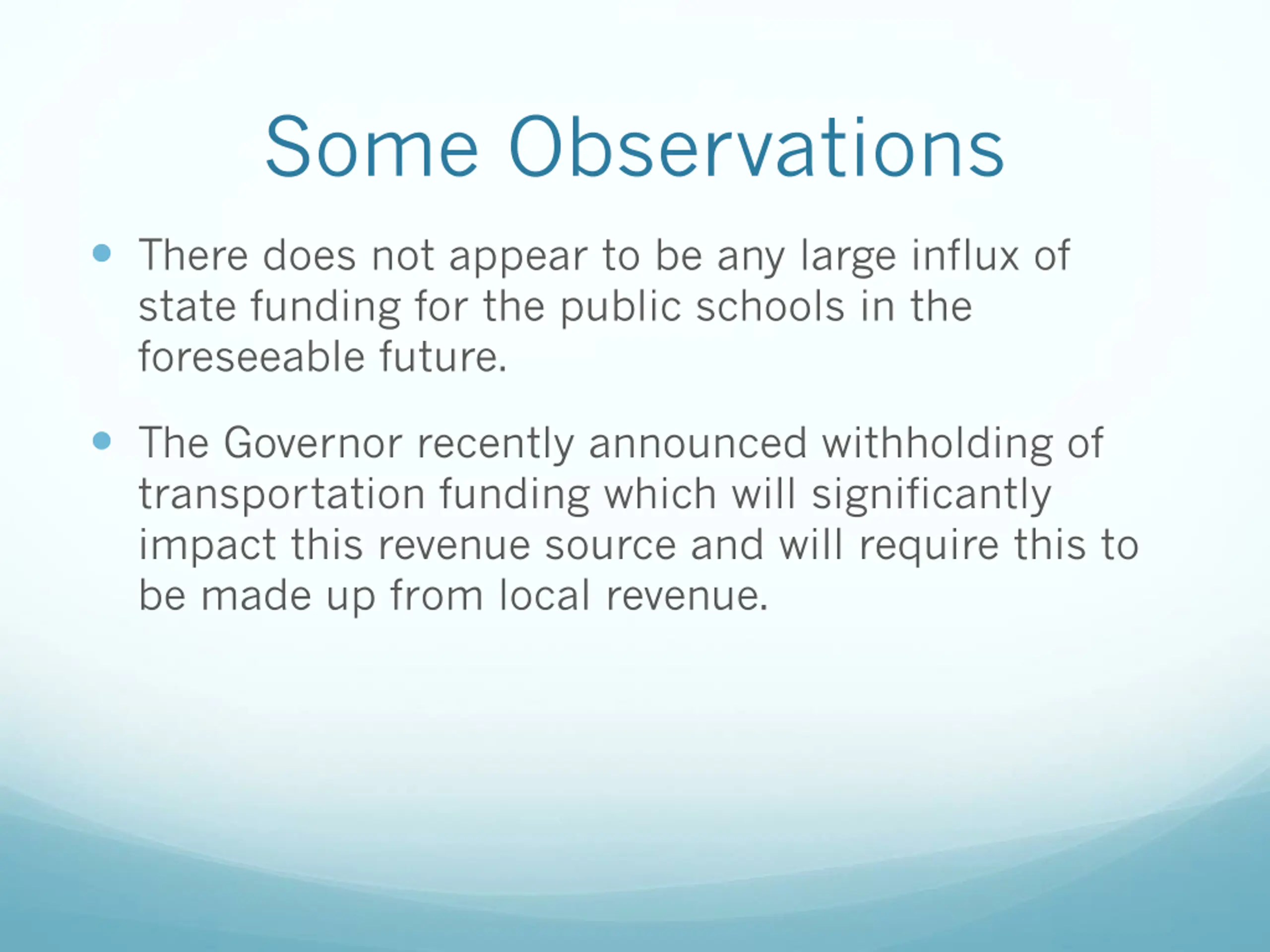 Some Observations There does not appear to be any large influx of state funding for the public schools in the foreseeable future. The Governor recently announced withholding of transportation funding which will significantly impact this revenue source and will require this to be made up from local revenue.