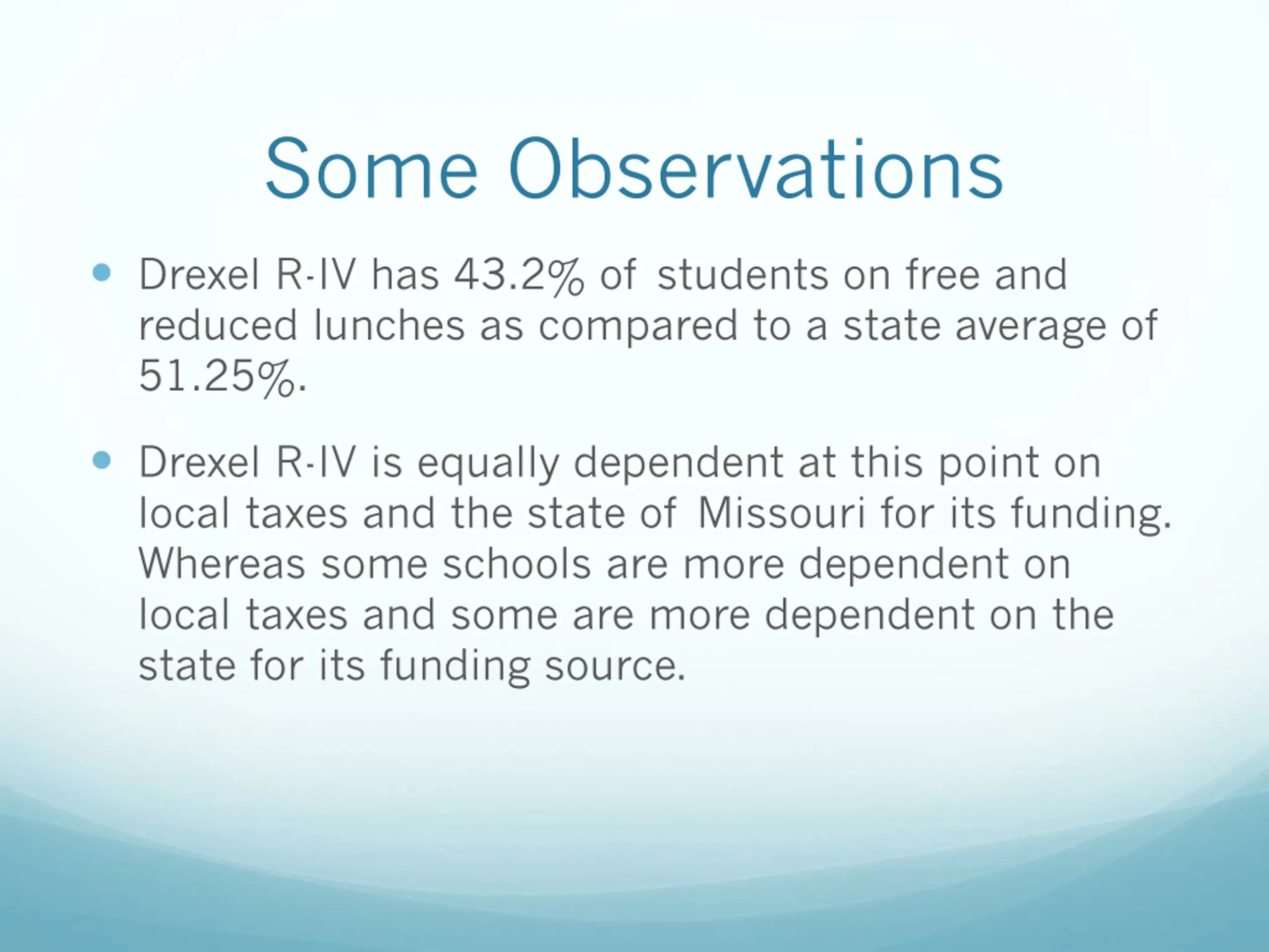 Some Observations Drexel R-IV has 43.2% of students on free and reduced lunches as compared to a state average of 51.25%. Drexel R-IV is equally dependent at this point on local taxes and the state of Missouri for its funding. Whereas some schools are more dependent on local taxes and some are more dependent on the state for its funding source.