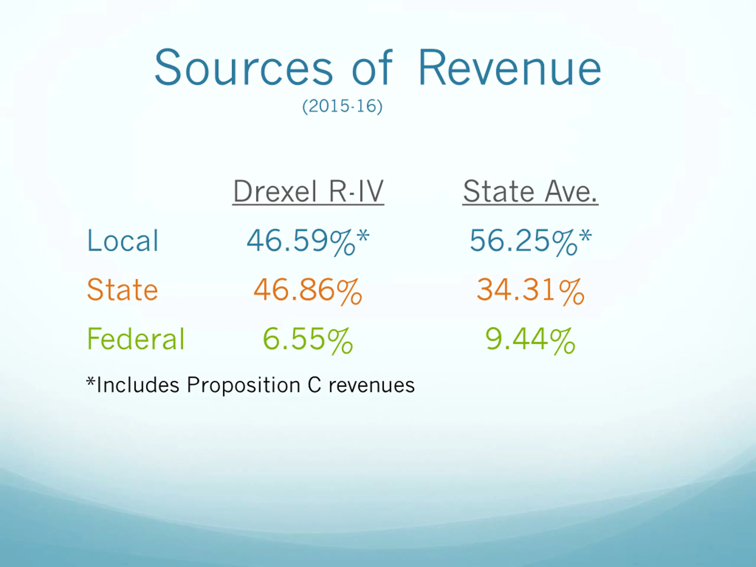 Sources of Revenue (2015-16) Drexel R-IV 46.59%* 46.86% 6.55% State Ave. 56.25%* 34.31% 9.44% Local State Federal *Includes Proposition C revenues