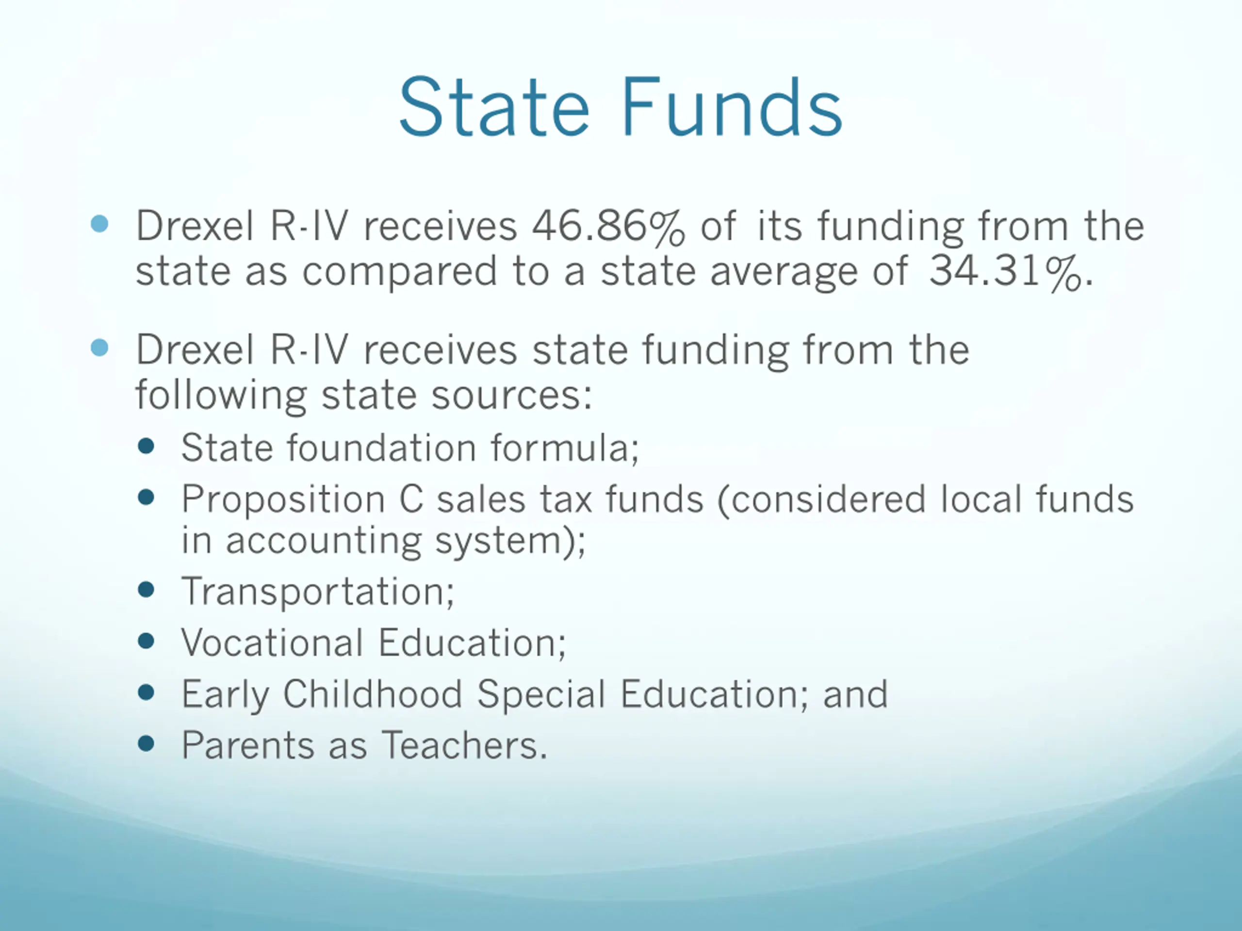 State Funds Drexel R-IV receives 46.86% of its funding from the state as compared to a state average of 34.31%. Drexel R-IV receives state funding from the following state sources: State foundation formula; Proposition C sales tax funds (considered local funds in accounting system); Transportation; Vocational Education; Early Childhood Special Education; and Parents as Teachers.