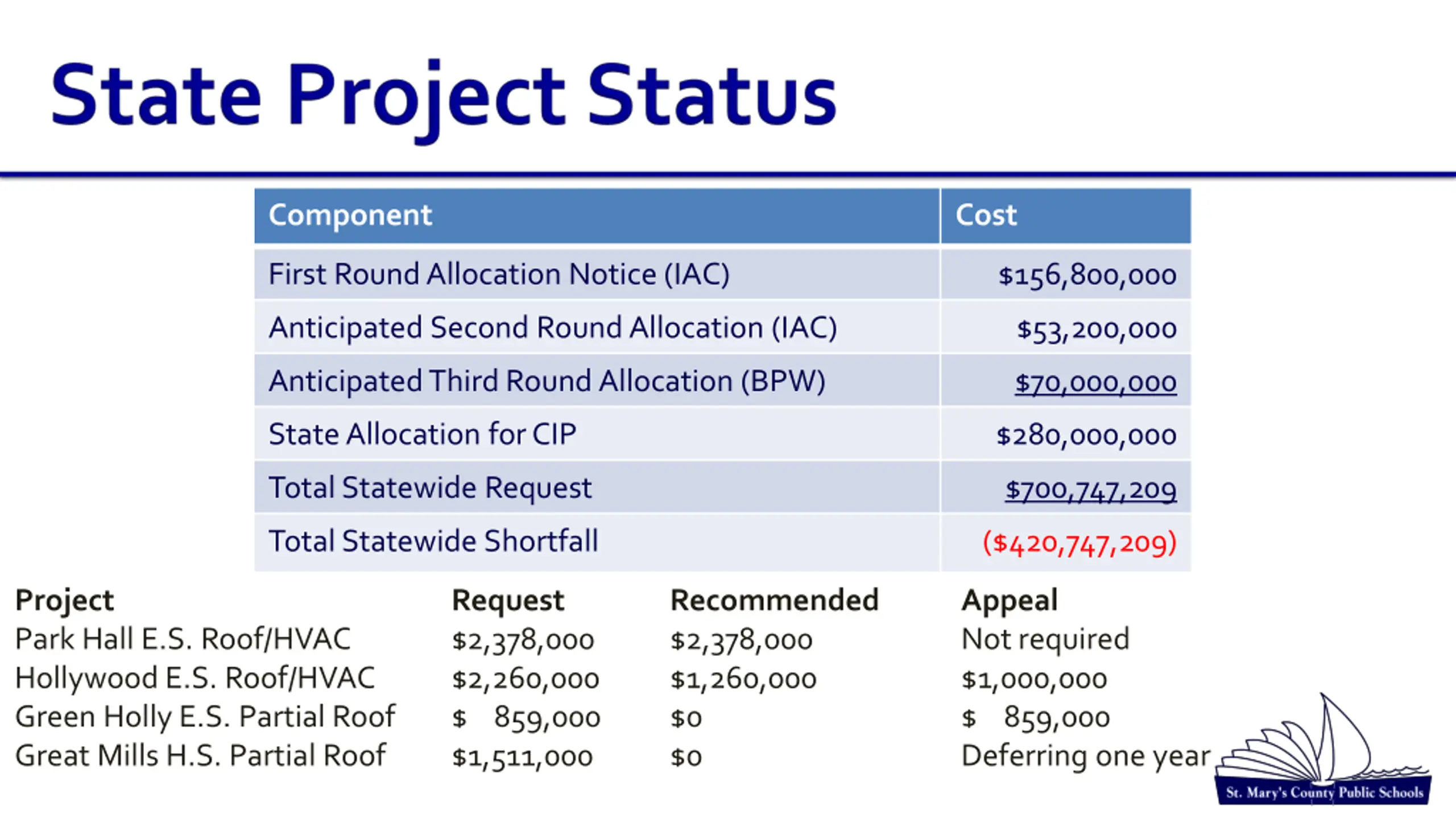 Component Cost First Round Allocation Notice (IAC) $156,800,000 Anticipated Second Round Allocation (IAC) $53,200,000 AnticipatedThird Round Allocation (BPW) $70,000,000 State Allocation for CIP $280,000,000 Total Statewide Request $700,747,209 Total Statewide Shortfall ($420,747,209) Project Park Hall E.S. Roof/HVAC Hollywood E.S. Roof/HVAC Green Holly E.S. Partial Roof Great Mills H.S. Partial Roof Request $2,378,000 $2,260,000 $ 859,000 $1,511,000 Recommended $2,378,000 $1,260,000 $0 $0 Appeal Not required $1,000,000 $ 859,000 Deferring one year