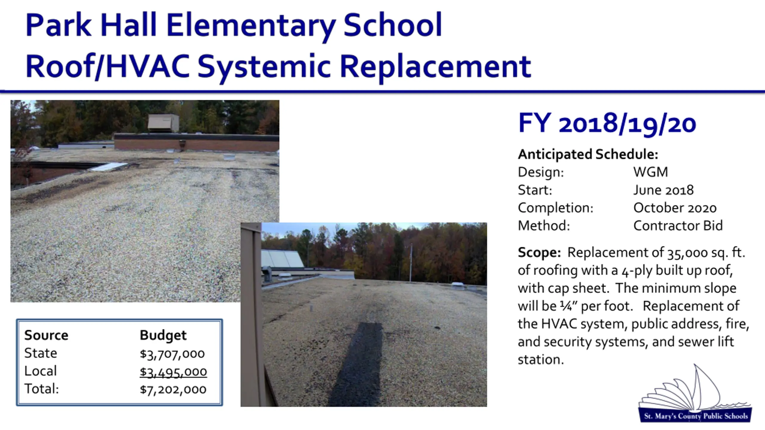 FY 2018/19/20 Anticipated Schedule: Design: Start: Completion: Method: WGM June 2018 October 2020 Contractor Bid Scope: Replacement of 35,000 sq. ft. of roofing with a 4-ply built up roof, with cap sheet. The minimum slope will be per foot. Replacement of the HVAC system, public address, fire, and security systems, and sewer lift station. Source State Local Total: Budget $3,707,000 $3,495,000 $7,202,000