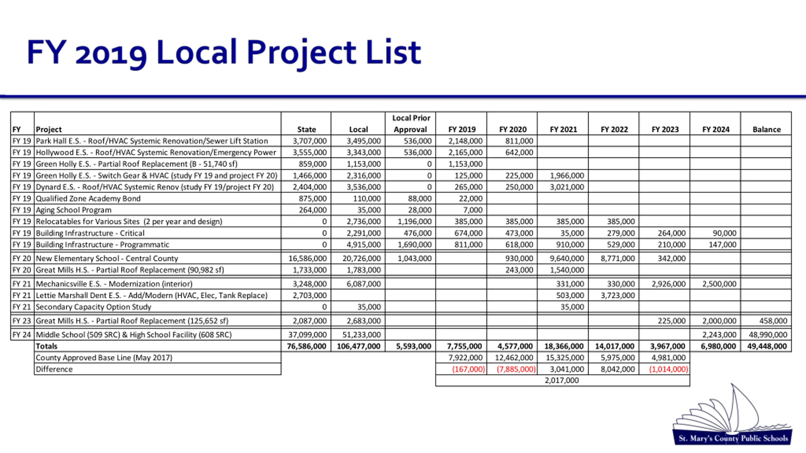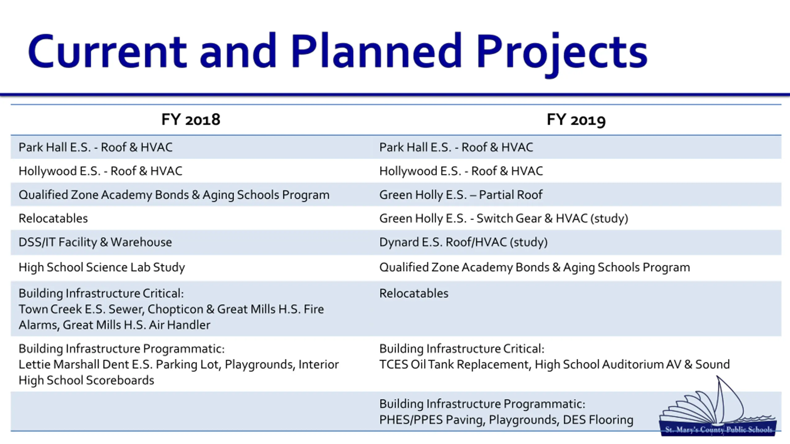 FY 2018 FY 2019 Park Hall E.S. - Roof & HVAC Park Hall E.S. - Roof & HVAC Hollywood E.S. - Roof & HVAC Hollywood E.S. - Roof & HVAC Qualified Zone Academy Bonds & Aging Schools Program Green Holly E.S. Partial Roof Relocatables Green Holly E.S. - Switch Gear & HVAC (study) DSS/IT Facility & Warehouse Dynard E.S. Roof/HVAC (study) High School Science Lab Study Qualified Zone Academy Bonds & Aging Schools Program Building Infrastructure Critical: Town Creek E.S. Sewer, Chopticon & Great Mills H.S. Fire Alarms, Great Mills H.S. Air Handler Relocatables Building Infrastructure Programmatic: Lettie Marshall Dent E.S. Parking Lot, Playgrounds, Interior High School Scoreboards Building Infrastructure Critical: TCES Oil Tank Replacement, High School Auditorium AV & Sound Building Infrastructure Programmatic: PHES/PPES Paving, Playgrounds, DES Flooring
