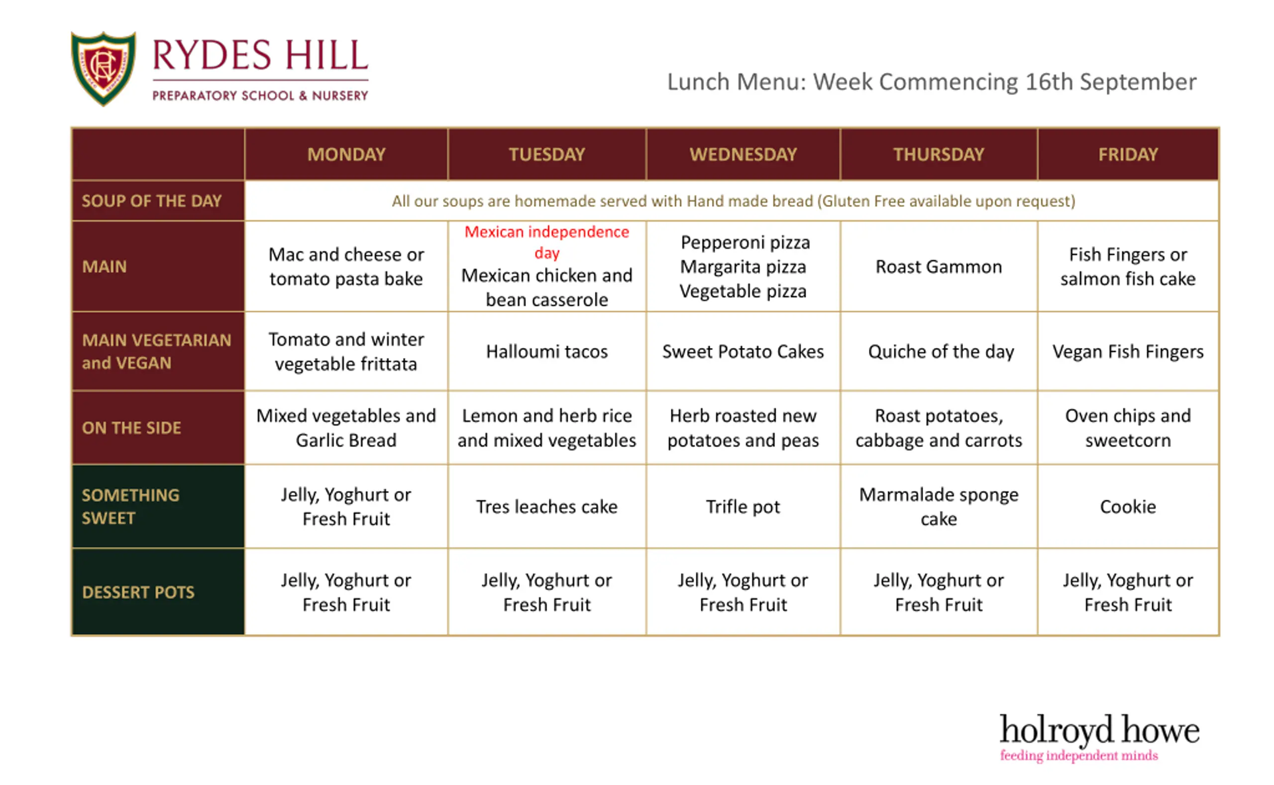 Lunch Menu: Week Commencing 16th September MONDAY TUESDAY WEDNESDAY THURSDAY FRIDAY SOUP OF THE DAY All our soups are homemade served with Hand made bread (Gluten Free available upon request) Mexican independence day Mexican chicken and bean casserole Pepperoni pizza Margarita pizza Vegetable pizza Mac and cheese or tomato pasta bake Fish Fingers or salmon fish cake Roast Gammon MAIN Tomato and winter vegetable frittata MAIN VEGETARIAN and VEGAN Halloumi tacos Sweet Potato Cakes Quiche of the day Vegan Fish Fingers Mixed vegetables and Garlic Bread Lemon and herb rice and mixed vegetables Herb roasted new potatoes and peas Roast potatoes, cabbage and carrots Oven chips and sweetcorn ON THE SIDE Jelly, Yoghurt or Fresh Fruit Marmalade sponge cake SOMETHING SWEET Tres leaches cake Trifle pot Cookie Jelly, Yoghurt or Fresh Fruit Jelly, Yoghurt or Fresh Fruit Jelly, Yoghurt or Fresh Fruit Jelly, Yoghurt or Fresh Fruit Jelly, Yoghurt or Fresh Fruit DESSERT POTS