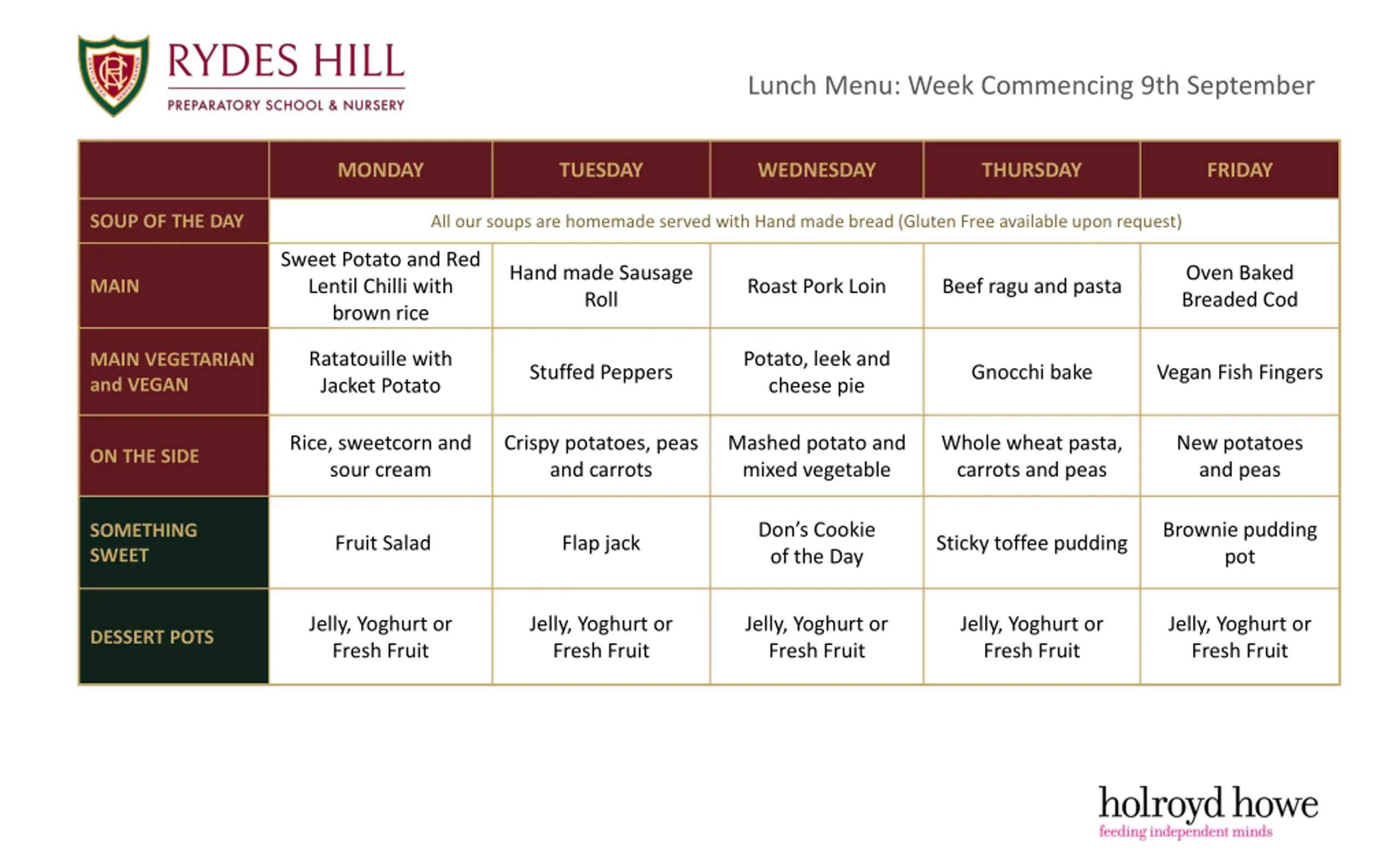 Lunch Menu: Week Commencing 9th September MONDAY TUESDAY WEDNESDAY THURSDAY FRIDAY SOUP OF THE DAY All our soups are homemade served with Hand made bread (Gluten Free available upon request) Sweet Potato and Red Lentil Chilli with brown rice Hand made Sausage Roll Oven Baked Breaded Cod Roast Pork Loin Beef ragu and pasta MAIN Ratatouille with Jacket Potato Potato, leek and cheese pie MAIN VEGETARIAN and VEGAN Stuffed Peppers Gnocchi bake Vegan Fish Fingers Rice, sweetcorn and sour cream Crispy potatoes, peas and carrots Mashed potato and mixed vegetable Whole wheat pasta, carrots and peas New potatoes and peas ON THE SIDE Don s Cookie of the Day Brownie pudding pot SOMETHING SWEET Fruit Salad Flap jack Sticky toffee pudding Jelly, Yoghurt or Fresh Fruit Jelly, Yoghurt or Fresh Fruit Jelly, Yoghurt or Fresh Fruit Jelly, Yoghurt or Fresh Fruit Jelly, Yoghurt or Fresh Fruit DESSERT POTS