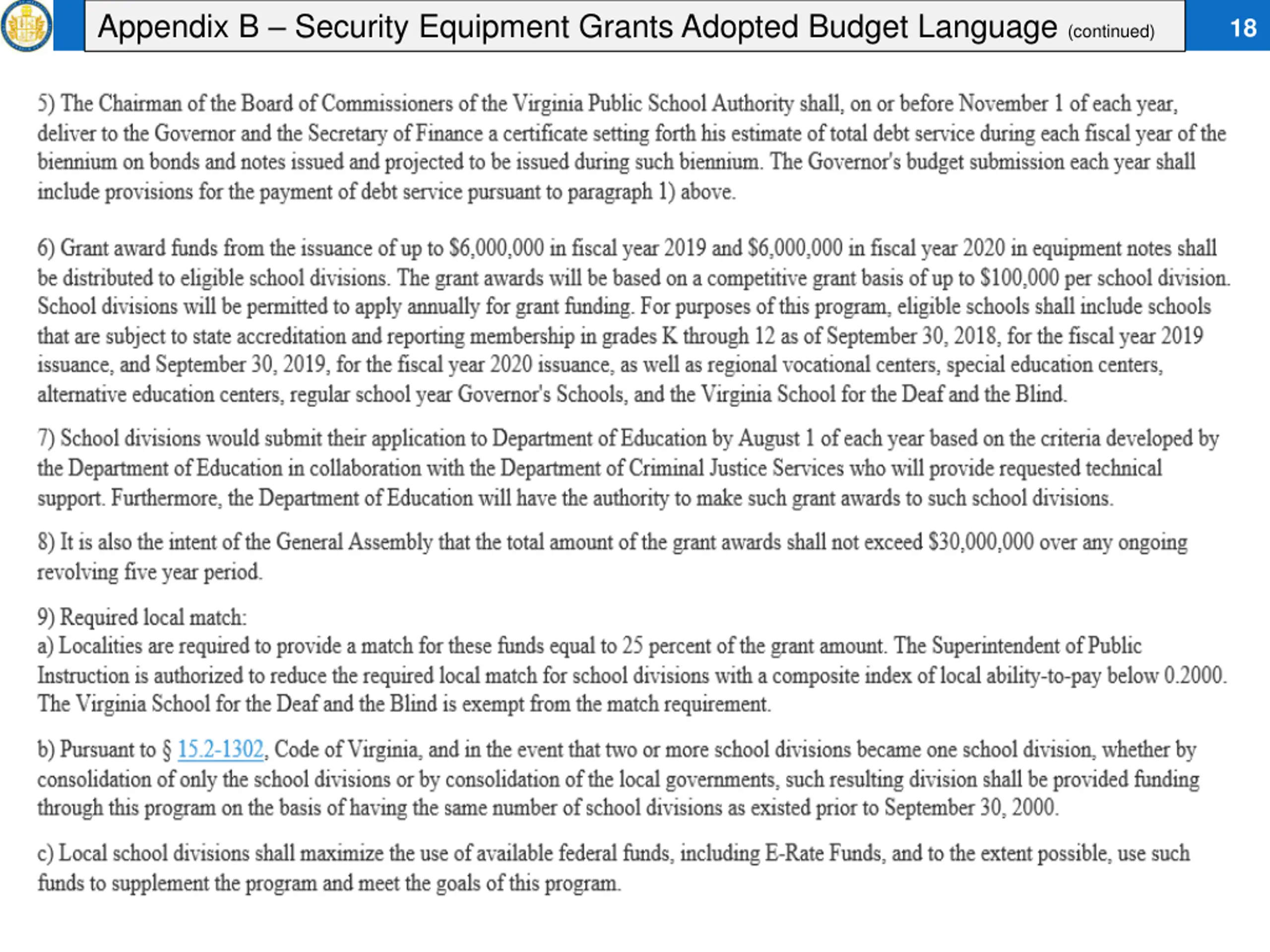 Appendix B Security Equipment Grants Adopted Budget Language (continued) 18