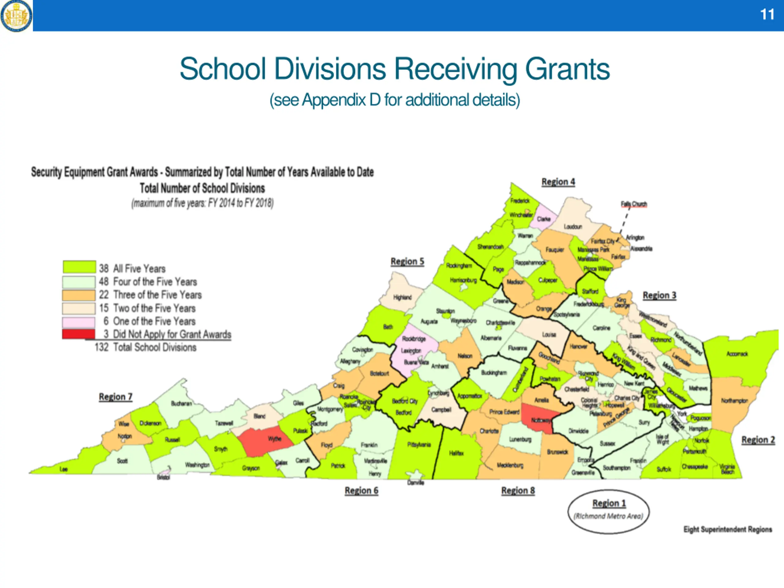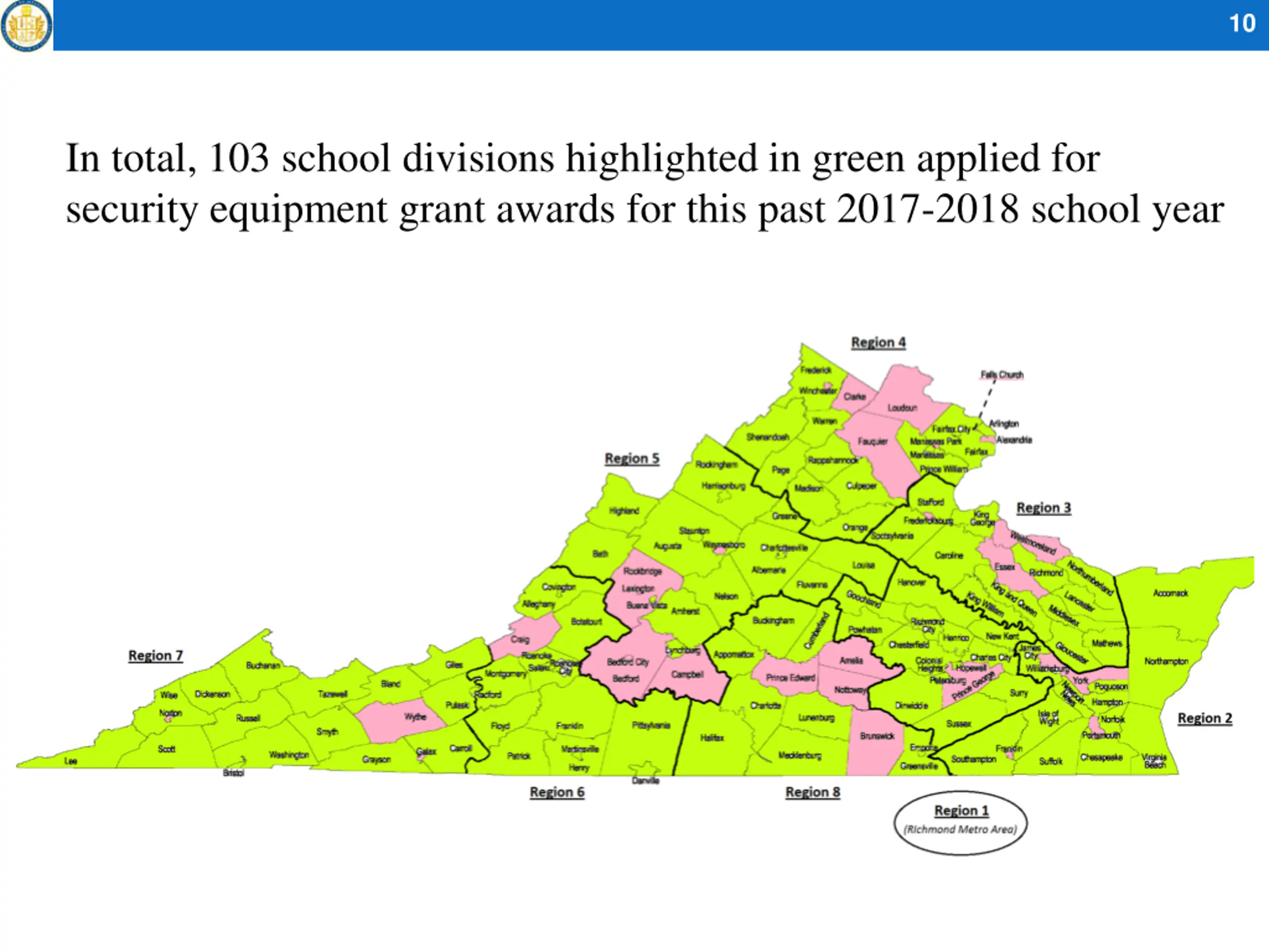 10 In total, 103 school divisions highlighted in green applied for security equipment grant awards for this past 2017-2018 school year