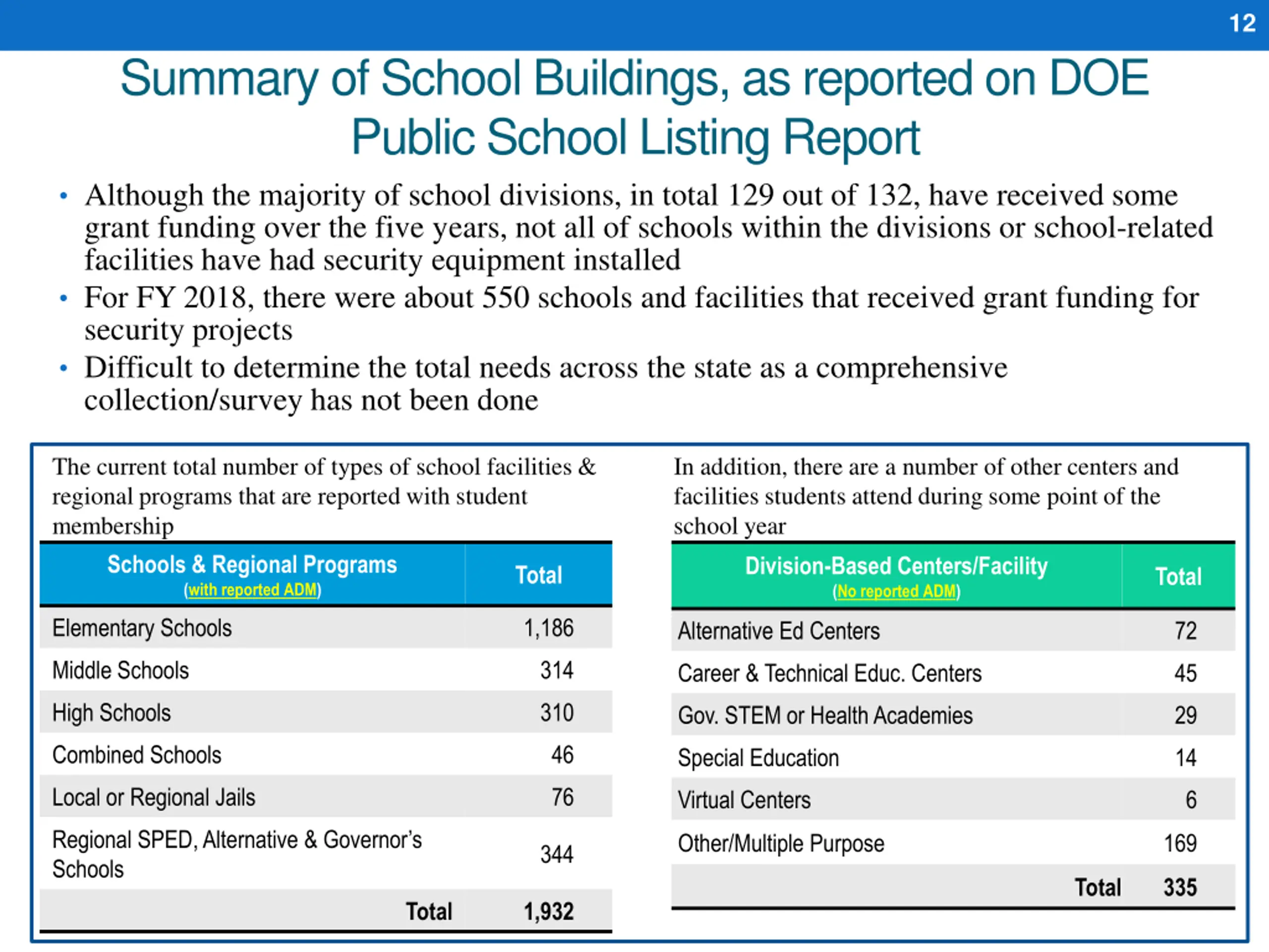 12 Summary of School Buildings, as reported on DOE Public School Listing Report Although the majority of school divisions, in total 129 out of 132, have received some grant funding over the five years, not all of schools within the divisions or school-related facilities have had security equipment installed For FY 2018, there were about 550 schools and facilities that received grant funding for security projects Difficult to determine the total needs across the state as a comprehensive collection/survey has not been done The current total number of types of school facilities & regional programs that are reported with student membership In addition, there are a number of other centers and facilities students attend during some point of the school year Division-Based Centers/Facility (No reported ADM) Schools & Regional Programs (with reported ADM) Total Total Elementary Schools 1,186 Alternative Ed Centers 72 Middle Schools 314 Career & Technical Educ. Centers 45 High Schools 310 Gov. STEM or Health Academies 29 Combined Schools 46 Special Education 14 Local or Regional Jails 76 Virtual Centers 6 Regional SPED, Alternative & Governor s Schools Other/Multiple Purpose 169 344 Total 335 Total 1,932