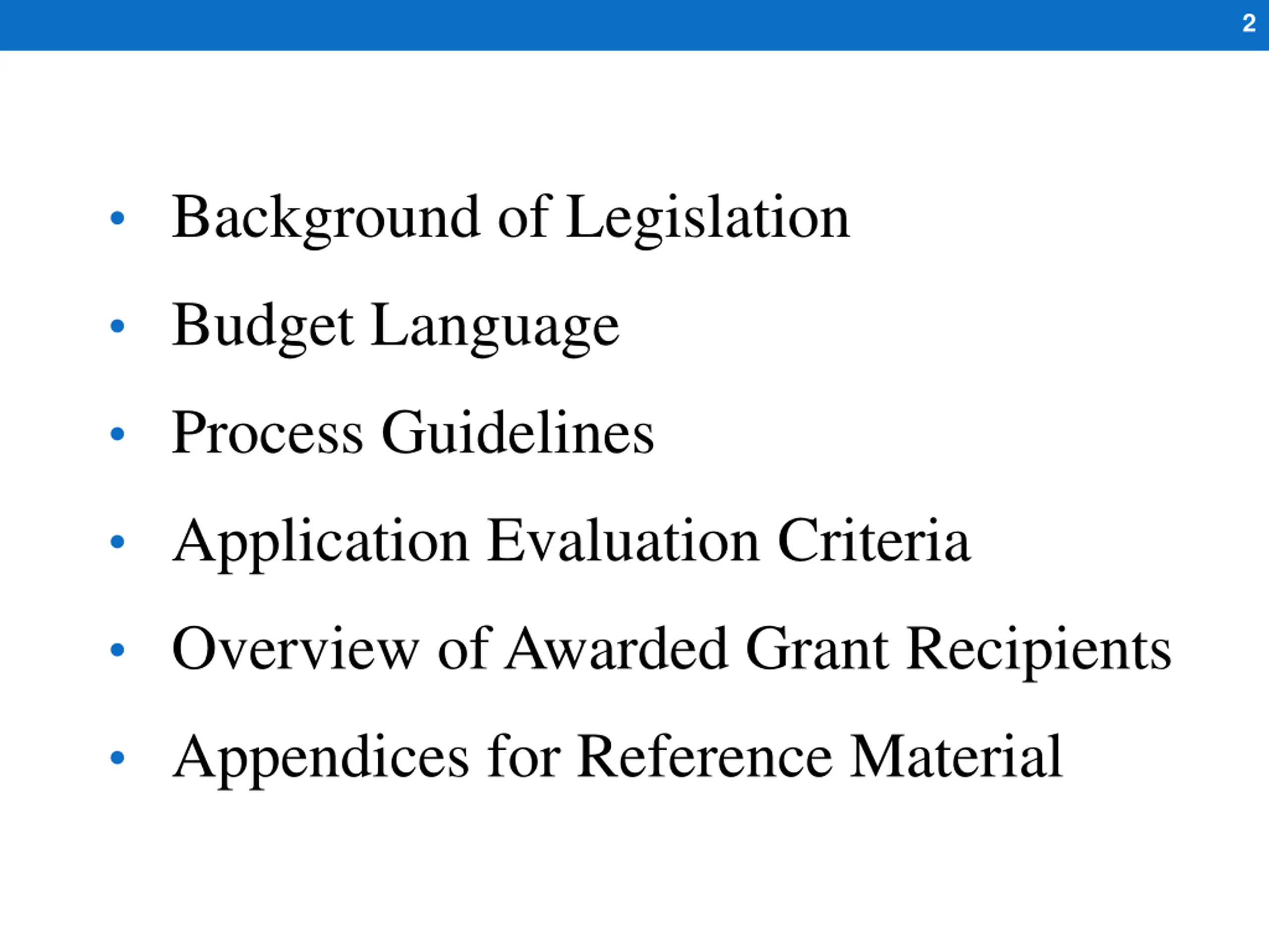 2 Background of Legislation Budget Language Process Guidelines Application Evaluation Criteria Overview of Awarded Grant Recipients Appendices for Reference Material