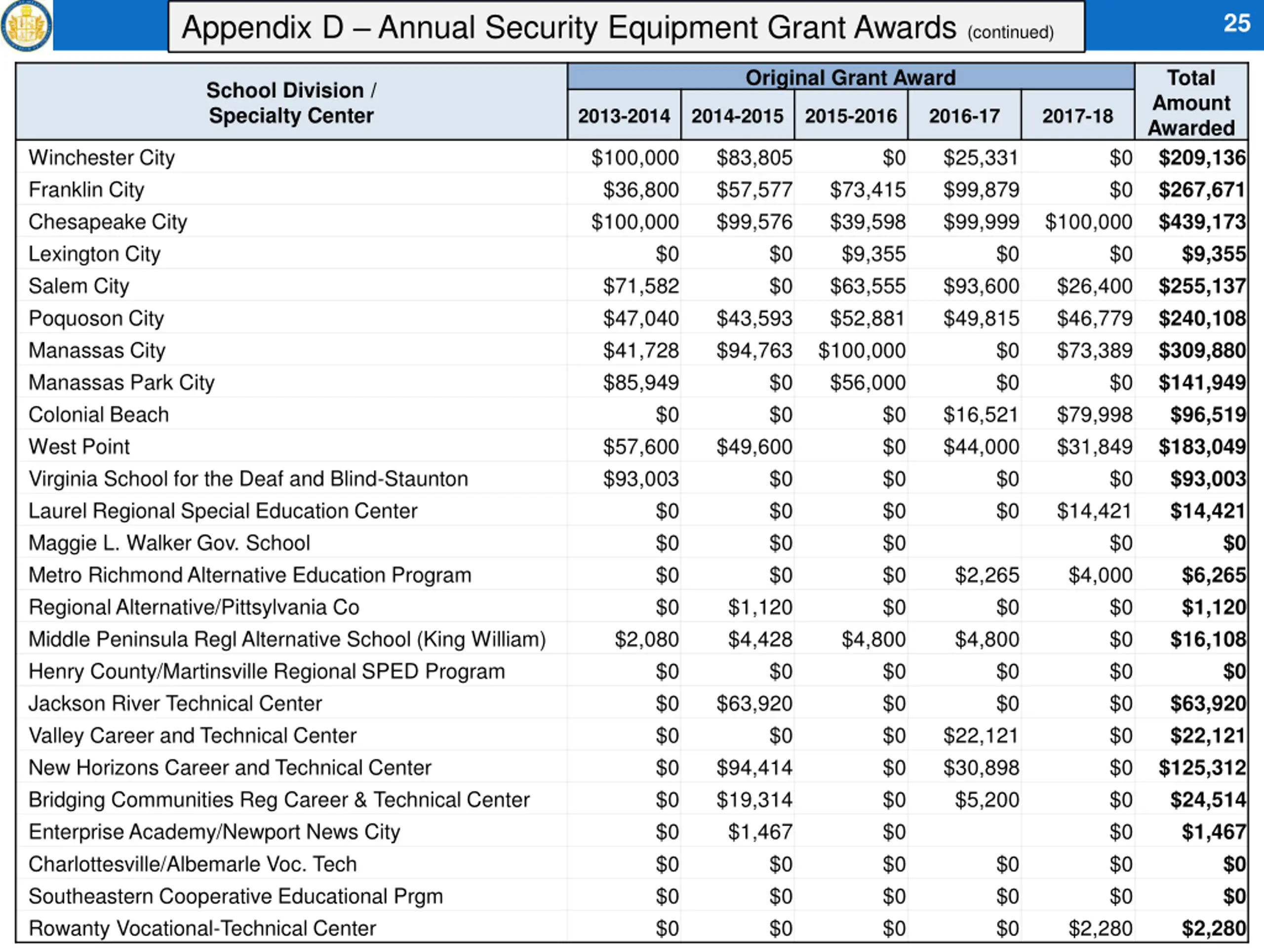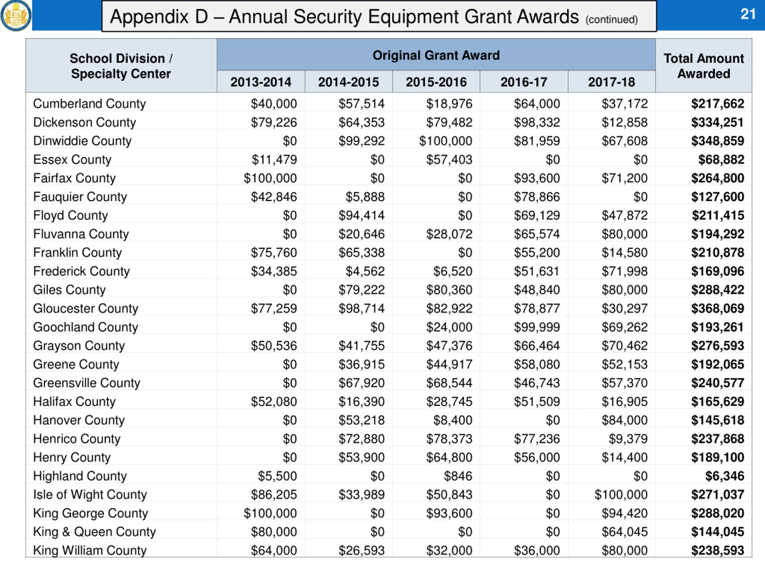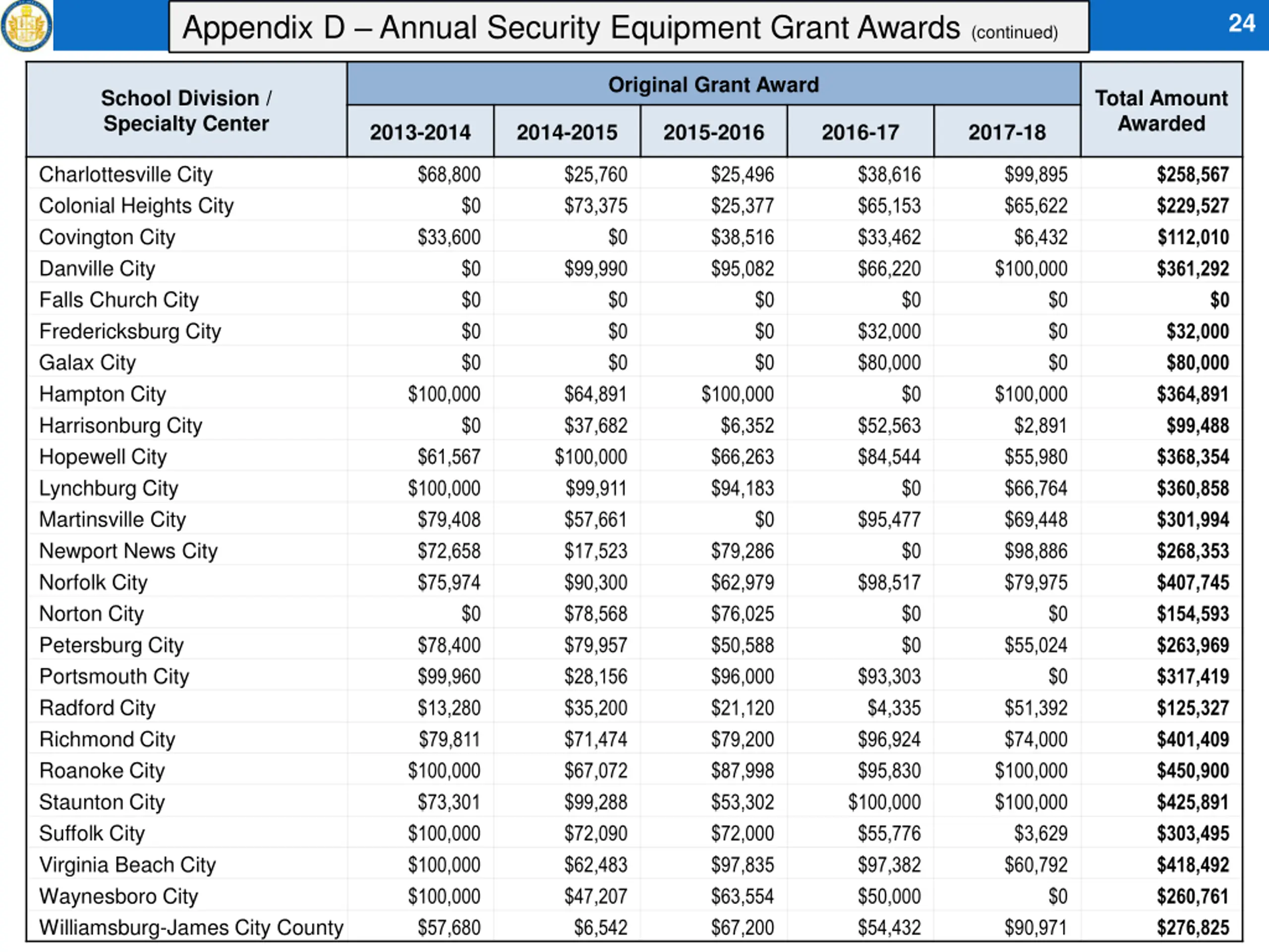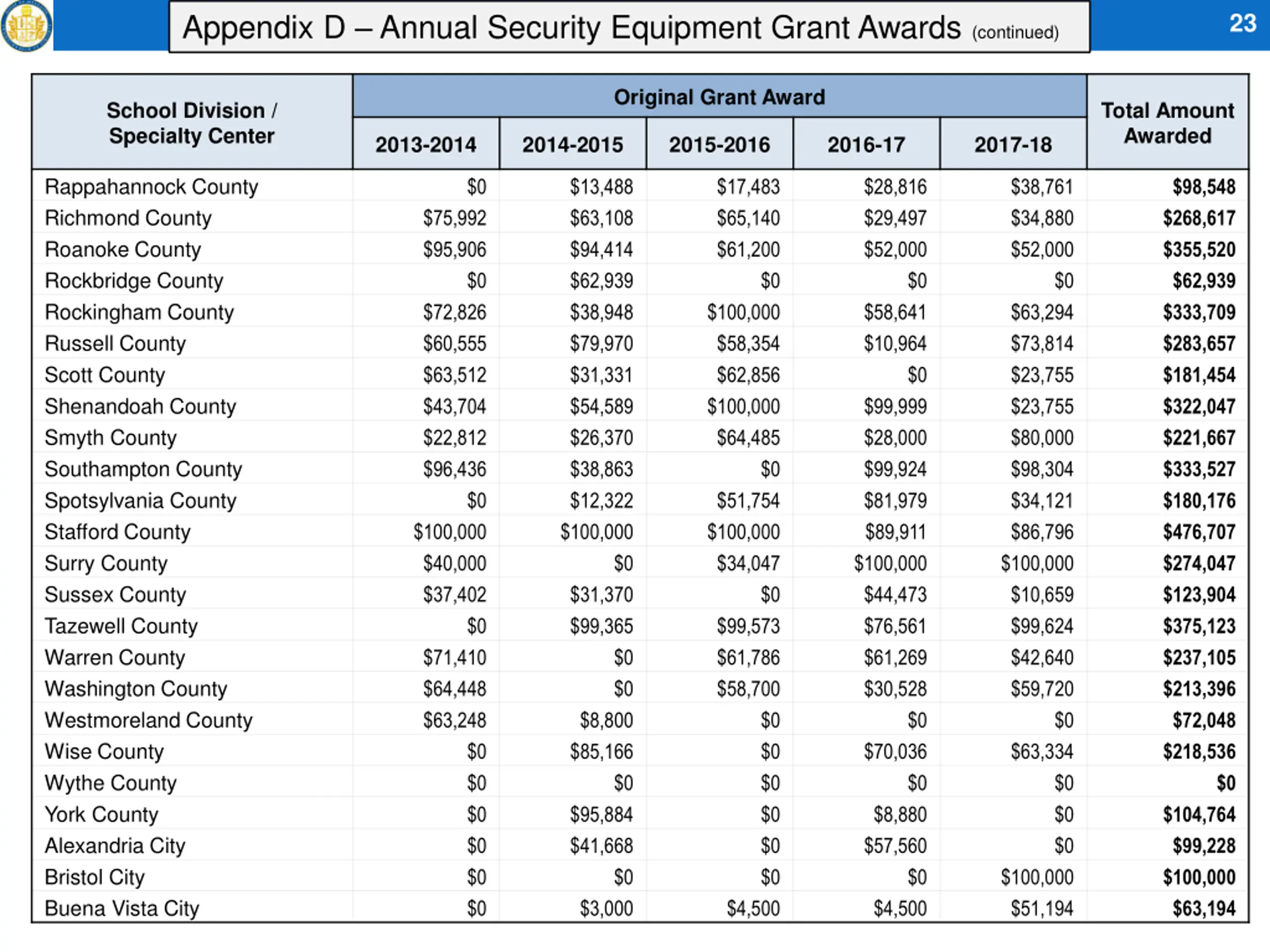 23 Appendix D Annual Security Equipment Grant Awards (continued) Original Grant Award School Division / Specialty Center Total Amount Awarded 2013-2014 2014-2015 2015-2016 2016-17 2017-18 Rappahannock County Richmond County Roanoke County Rockbridge County Rockingham County Russell County Scott County Shenandoah County Smyth County Southampton County Spotsylvania County Stafford County Surry County Sussex County Tazewell County Warren County Washington County Westmoreland County Wise County Wythe County York County Alexandria City Bristol City Buena Vista City $0 $13,488 $63,108 $94,414 $62,939 $38,948 $79,970 $31,331 $54,589 $26,370 $38,863 $12,322 $100,000 $17,483 $65,140 $61,200 $28,816 $29,497 $52,000 $38,761 $34,880 $52,000 $98,548 $268,617 $355,520 $62,939 $333,709 $283,657 $181,454 $322,047 $221,667 $333,527 $180,176 $476,707 $274,047 $123,904 $375,123 $237,105 $213,396 $72,048 $218,536 $75,992 $95,906 $0 $0 $0 $0 $72,826 $60,555 $63,512 $43,704 $22,812 $96,436 $100,000 $58,354 $62,856 $100,000 $64,485 $58,641 $10,964 $63,294 $73,814 $23,755 $23,755 $80,000 $98,304 $34,121 $86,796 $100,000 $10,659 $99,624 $42,640 $59,720 $0 $99,999 $28,000 $99,924 $81,979 $89,911 $100,000 $44,473 $76,561 $61,269 $30,528 $0 $0 $51,754 $100,000 $34,047 $100,000 $40,000 $37,402 $0 $31,370 $99,365 $0 $0 $99,573 $61,786 $58,700 $71,410 $64,448 $63,248 $0 $0 $8,800 $85,166 $0 $0 $0 $0 $0 $0 $0 $0 $0 $0 $0 $0 $0 $0 $70,036 $63,334 $0 $0 $0 $0 $0 $0 $95,884 $41,668 $8,880 $57,560 $104,764 $99,228 $100,000 $63,194 $0 $0 $100,000 $51,194 $3,000 $4,500 $4,500