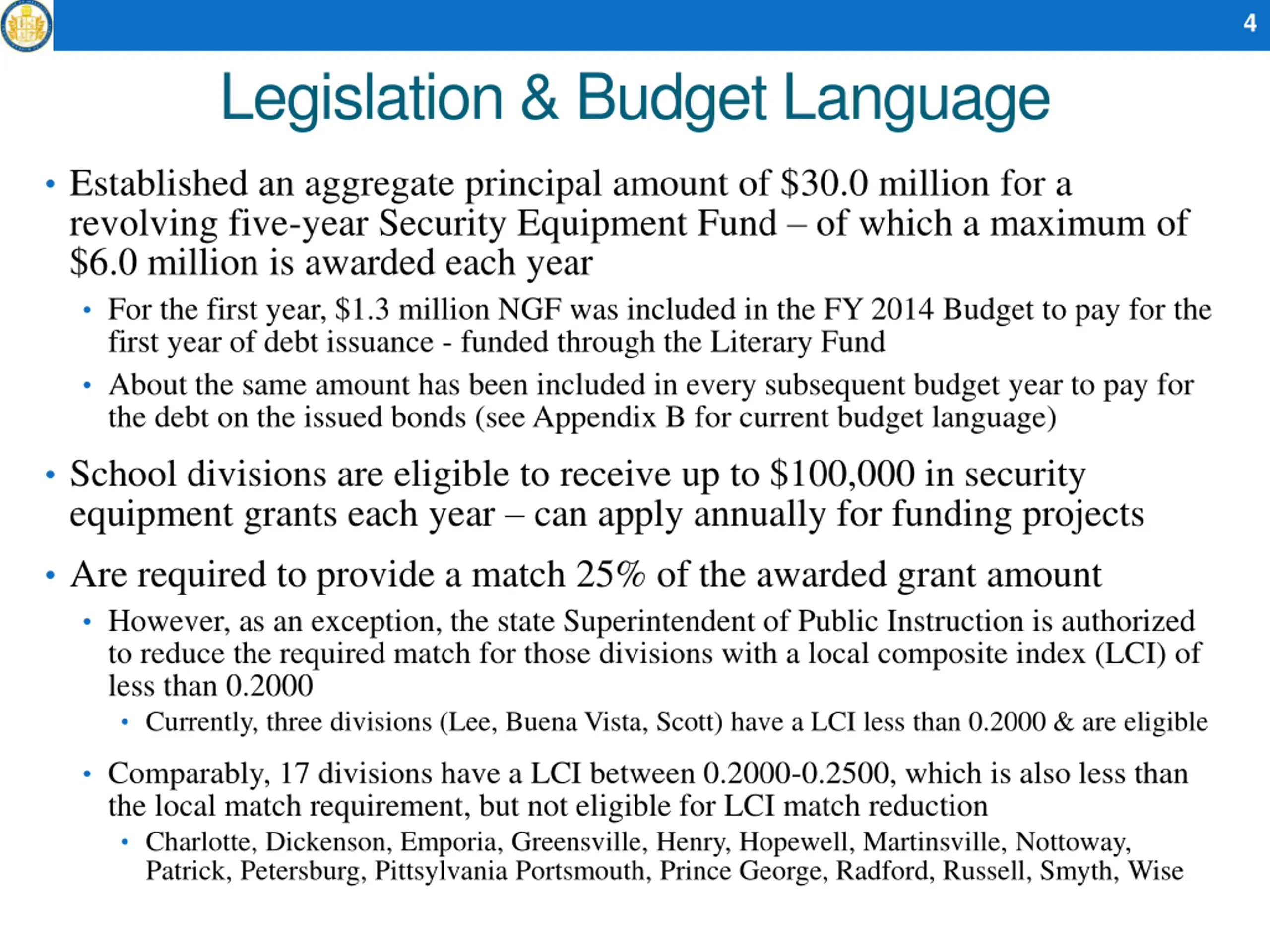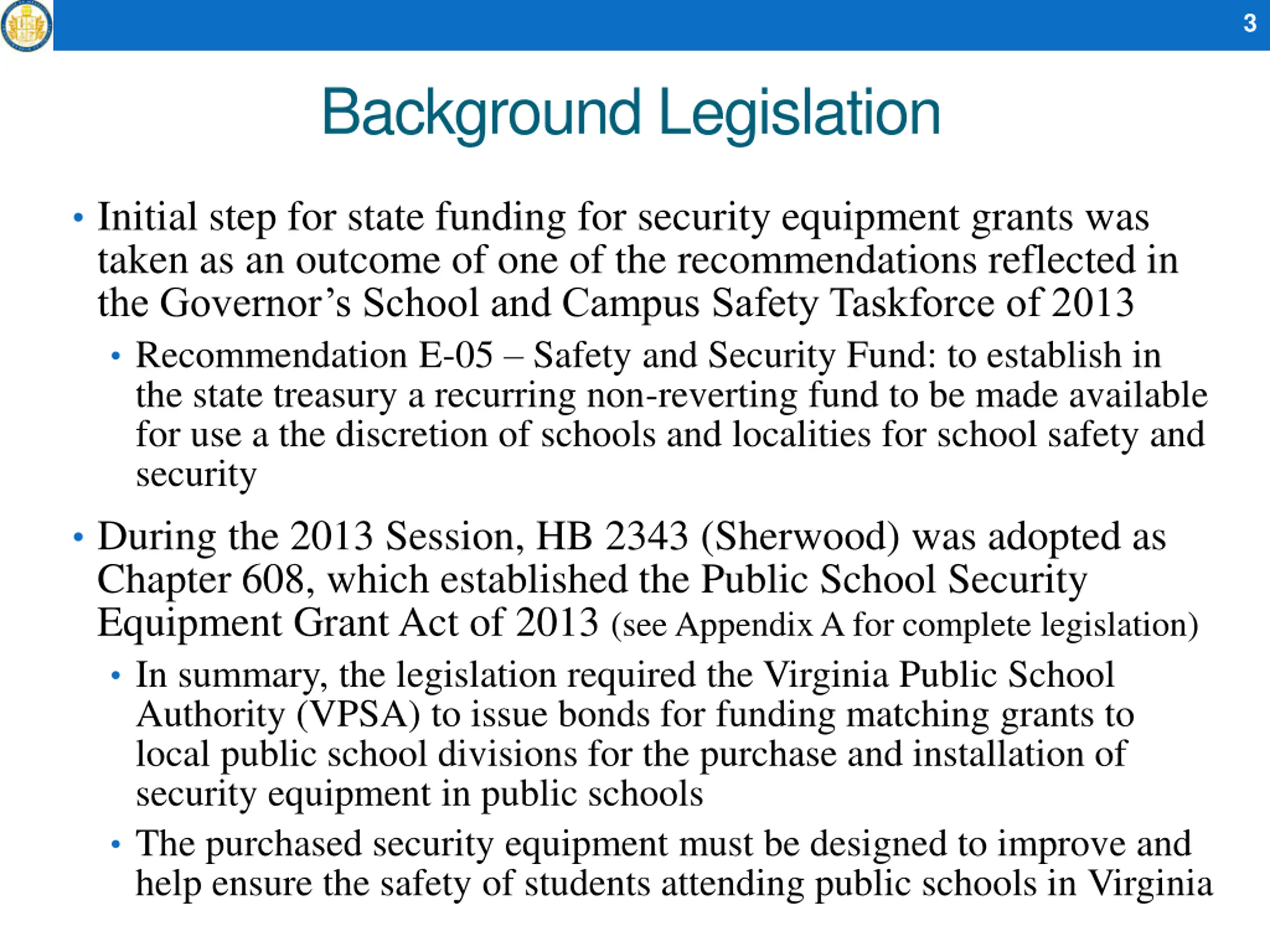 3 Background Legislation Initial step for state funding for security equipment grants was taken as an outcome of one of the recommendations reflected in the Governor s School and Campus Safety Taskforce of 2013 Recommendation E-05 Safety and Security Fund: to establish in the state treasury a recurring non-reverting fund to be made available for use a the discretion of schools and localities for school safety and security During the 2013 Session, HB 2343 (Sherwood) was adopted as Chapter 608, which established the Public School Security Equipment Grant Act of 2013 (see Appendix A for complete legislation) In summary, the legislation required the Virginia Public School Authority (VPSA) to issue bonds for funding matching grants to local public school divisions for the purchase and installation of security equipment in public schools The purchased security equipment must be designed to improve and help ensure the safety of students attending public schools in Virginia