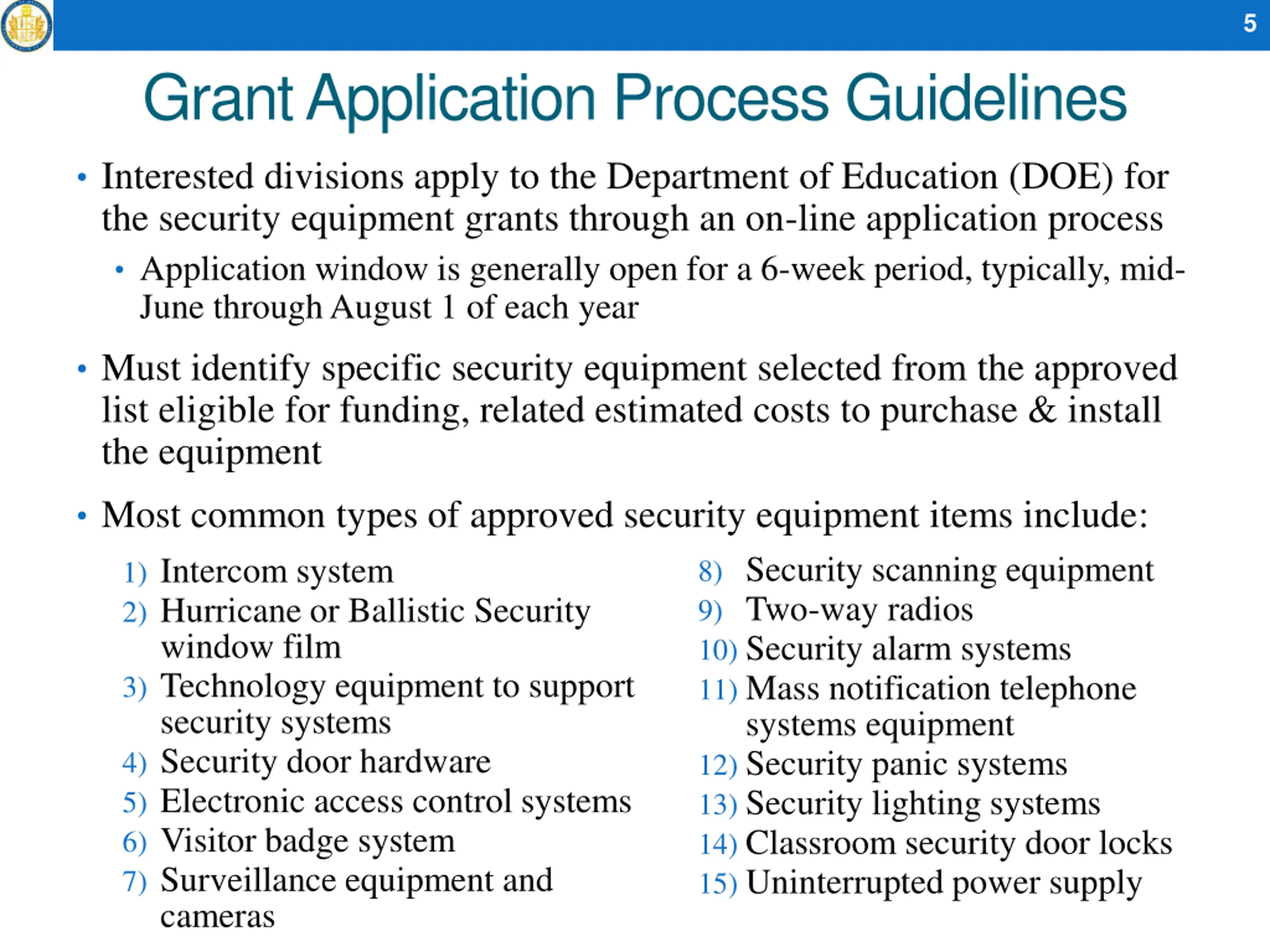 5 Grant Application Process Guidelines Interested divisions apply to the Department of Education (DOE) for the security equipment grants through an on-line application process Application window is generally open for a 6-week period, typically, mid- June through August 1 of each year Must identify specific security equipment selected from the approved list eligible for funding, related estimated costs to purchase & install the equipment Most common types of approved security equipment items include: 1) Intercom system 2) Hurricane or Ballistic Security window film 3) Technology equipment to support security systems 4) Security door hardware 5) Electronic access control systems 6) Visitor badge system 7) Surveillance equipment and cameras 8) Security scanning equipment 9) Two-way radios 10) Security alarm systems 11) Mass notification telephone systems equipment 12) Security panic systems 13) Security lighting systems 14) Classroom security door locks 15) Uninterrupted power supply