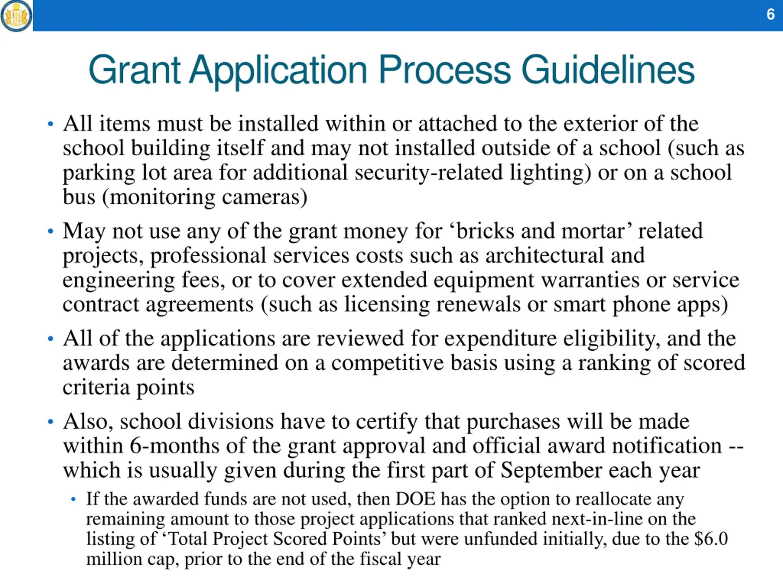 6 Grant Application Process Guidelines All items must be installed within or attached to the exterior of the school building itself and may not installed outside of a school (such as parking lot area for additional security-related lighting) or on a school bus (monitoring cameras) May not use any of the grant money for bricks and mortar related projects, professional services costs such as architectural and engineering fees, or to cover extended equipment warranties or service contract agreements (such as licensing renewals or smart phone apps) All of the applications are reviewed for expenditure eligibility, and the awards are determined on a competitive basis using a ranking of scored criteria points Also, school divisions have to certify that purchases will be made within 6-months of the grant approval and official award notification -- which is usually given during the first part of September each year If the awarded funds are not used, then DOE has the option to reallocate any remaining amount to those project applications that ranked next-in-line on the listing of Total Project Scored Points but were unfunded initially, due to the $6.0 million cap, prior to the end of the fiscal year