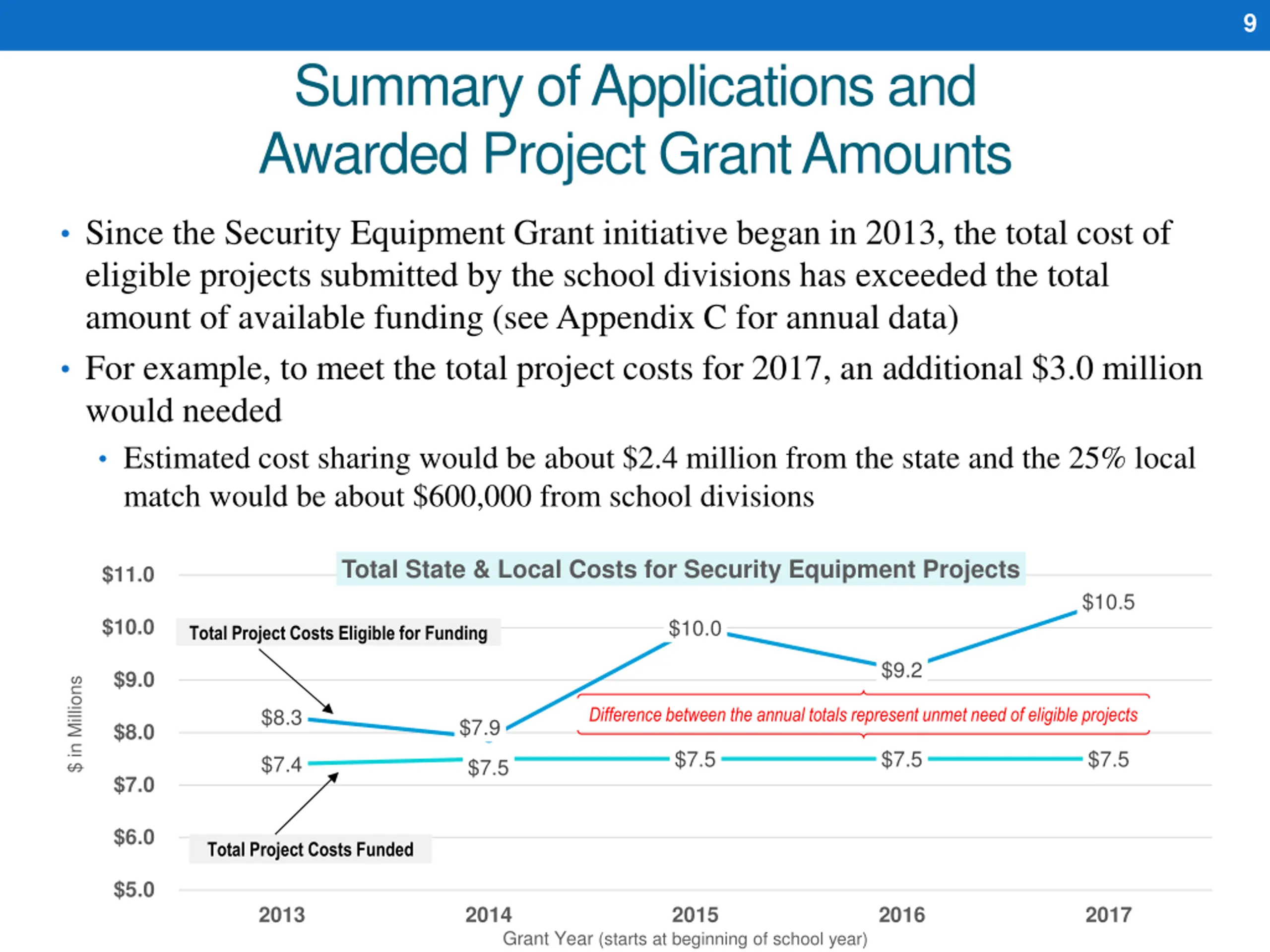 9 Summary of Applications and Awarded Project Grant Amounts Since the Security Equipment Grant initiative began in 2013, the total cost of eligible projects submitted by the school divisions has exceeded the total amount of available funding (see Appendix C for annual data) For example, to meet the total project costs for 2017, an additional $3.0 million would needed Estimated cost sharing would be about $2.4 million from the state and the 25% local match would be about $600,000 from school divisions Total State & Local Costs for Security Equipment Projects $11.0 $10.5 $10.0 $10.0 Total Project Costs Eligible for Funding $9.2 $9.0 $ in Millions Difference between the annual totals represent unmet need of eligible projects $8.3 $7.9 $8.0 $7.5 $7.5 $7.5 $7.4 $7.5 $7.0 $6.0 Total Project Costs Funded $5.0 2013 2014 2015 2016 2017 Grant Year (starts at beginning of school year)