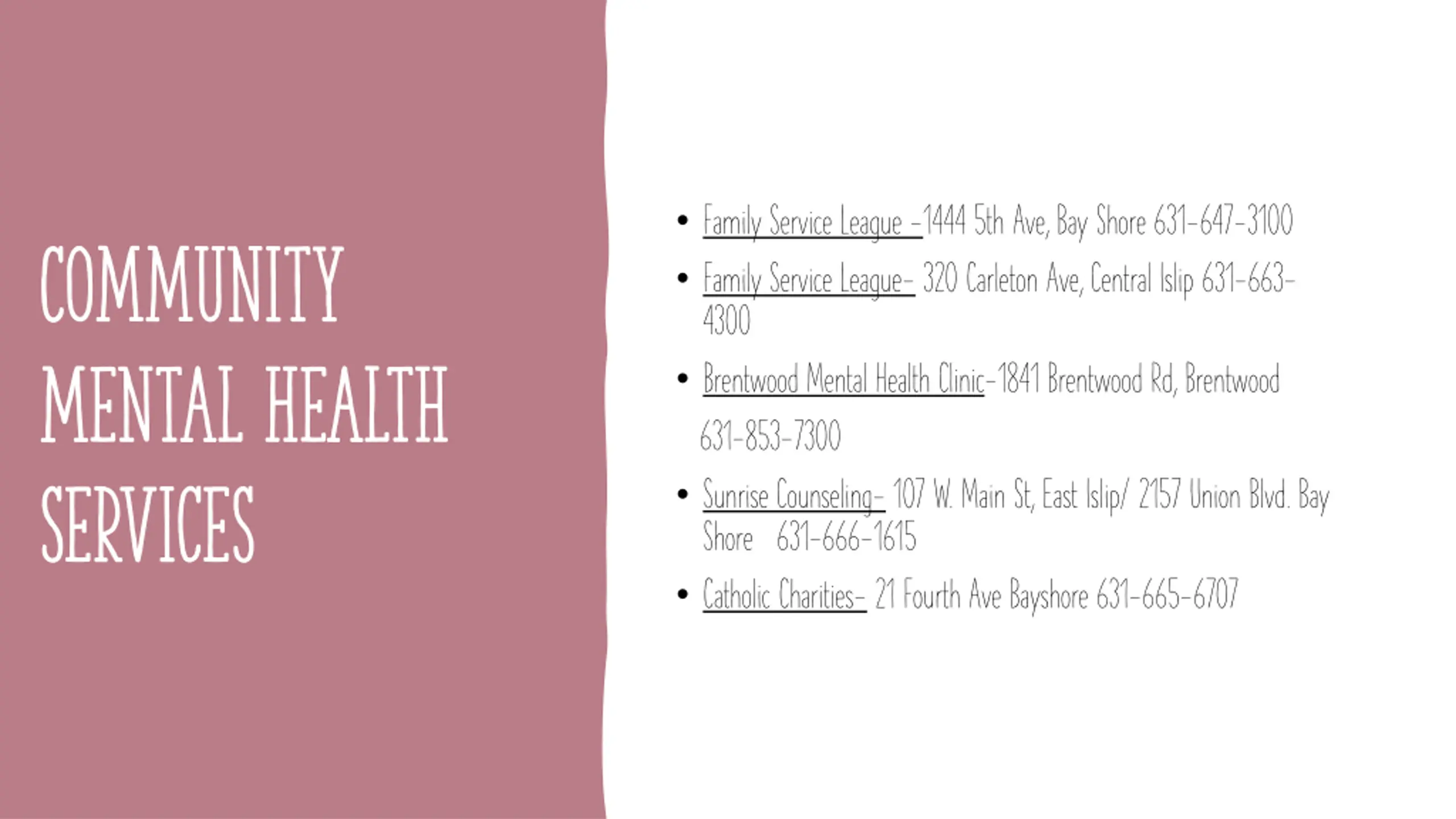 Family Service League -1444 5th Ave, Bay Shore 631-647-3100 Family Service League- 320 Carleton Ave, Central Islip 631-663- 4300 Brentwood Mental Health Clinic-1841 Brentwood Rd, Brentwood 631-853-7300 Sunrise Counseling- 107 W. Main St, East Islip/ 2157 Union Blvd. Bay Shore 631-666-1615 Catholic Charities- 21 Fourth Ave Bayshore 631-665-6707 Community Mental Health Services