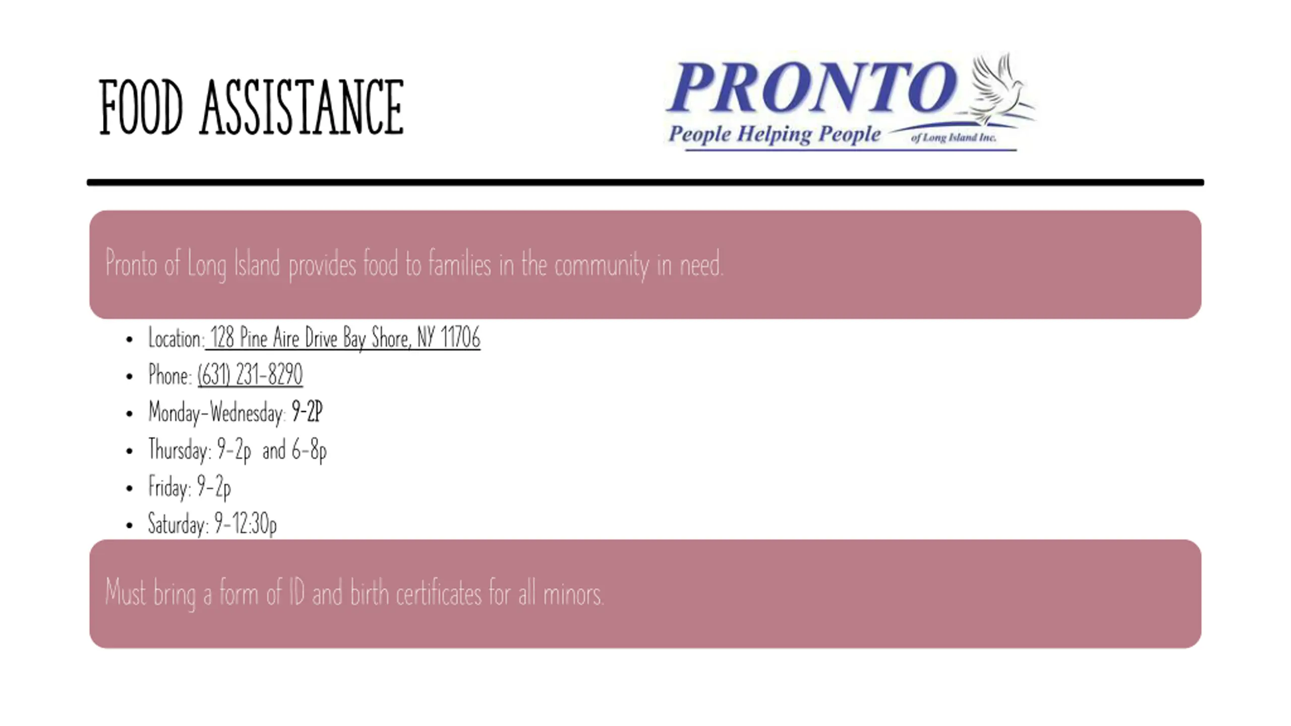 Food assistance Pronto of Long Island provides food to families in the community in need. Location: 128 Pine Aire Drive Bay Shore, NY 11706 Phone: (631) 231-8290 Monday-Wednesday: 9-2p Thursday: 9-2p and 6-8p Friday: 9-2p Saturday:9-12:30p Must bring a form of ID and birth certificates for all minors.