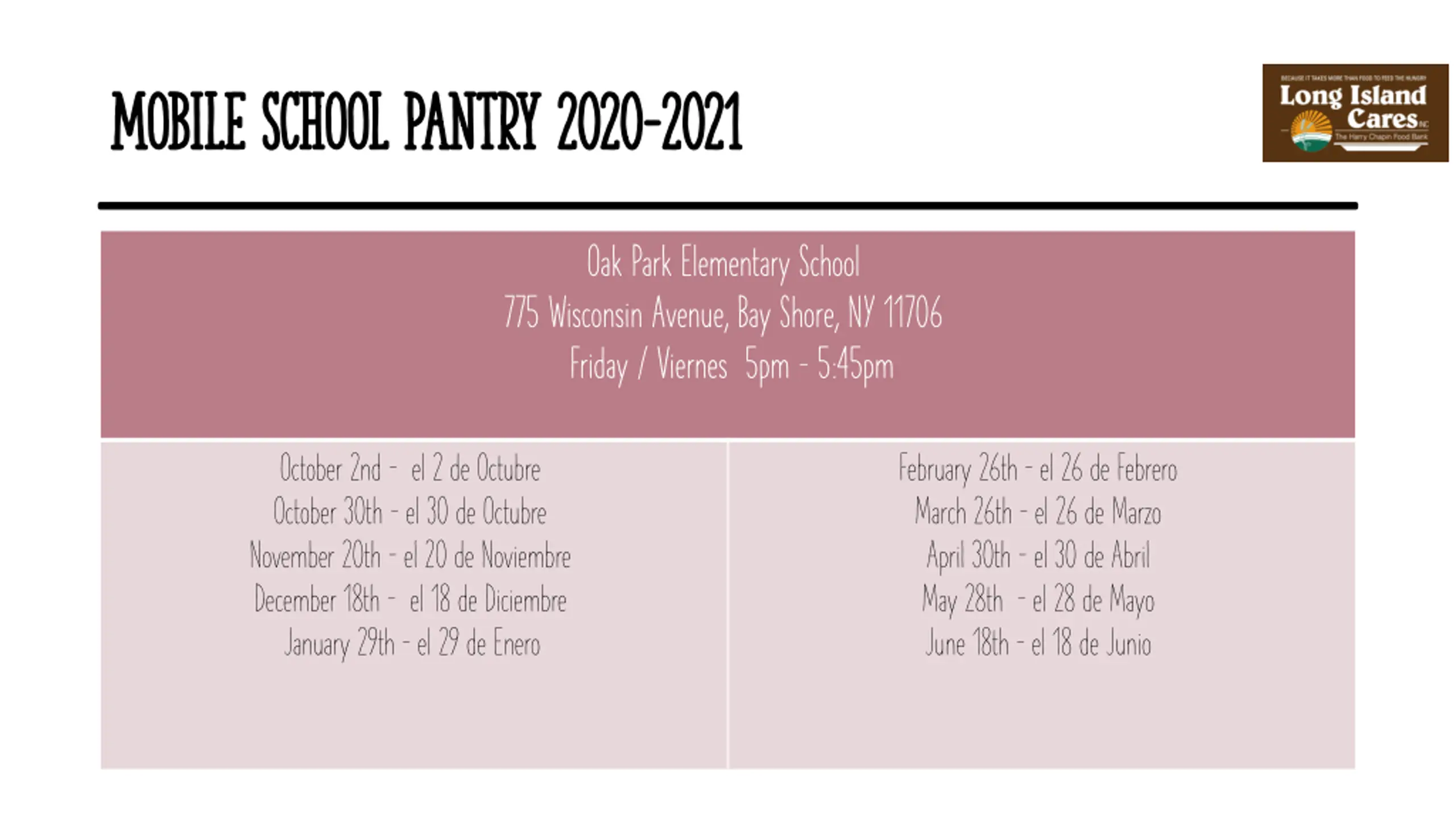 Mobile School Pantry Mobile School Pantry 2020 2020- -2021 2021 Oak Park Elementary School 775 Wisconsin Avenue, Bay Shore, NY 11706 Friday / Viernes 5pm 5:45pm October2nd el2deOctubre October30th el30deOctubre November20th el20deNoviembre December18th el18deDiciembre January29th el29de Enero February 26th el26deFebrero March 26th el26deMarzo April 30th el30 deAbril May28th el28de Mayo June18th el18de Junio