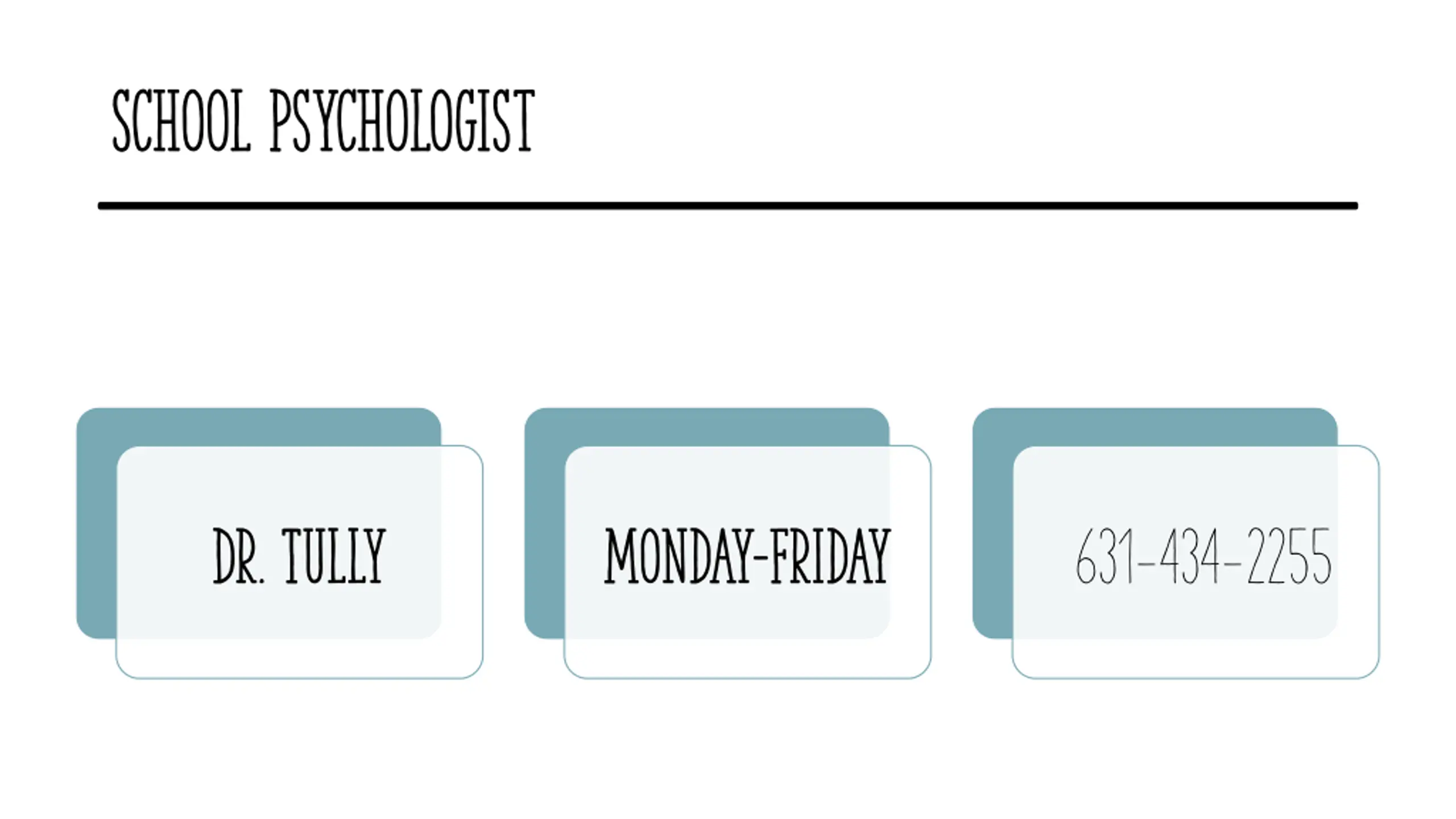 School Psychologist Dr. Tully Monday-Friday 631-434-2255
