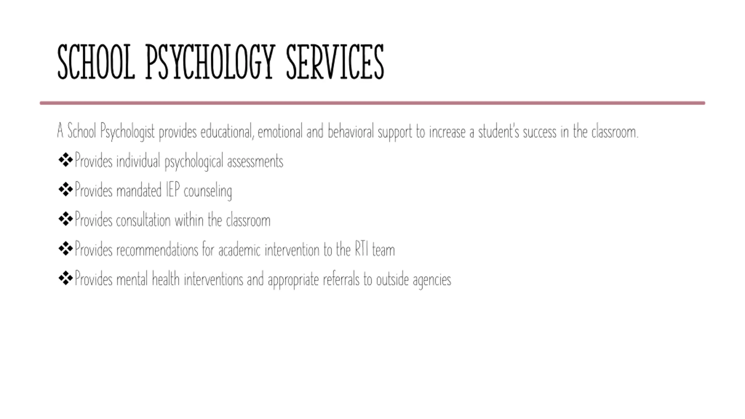 School Psychology Services A School Psychologist provides educational, emotional and behavioral support to increase a student's success in the classroom. Provides individual psychological assessments Provides mandated IEP counseling Providesconsultation within the classroom Providesrecommendationsfor academic intervention to the RTI team Providesmental health interventions and appropriate referrals to outside agencies