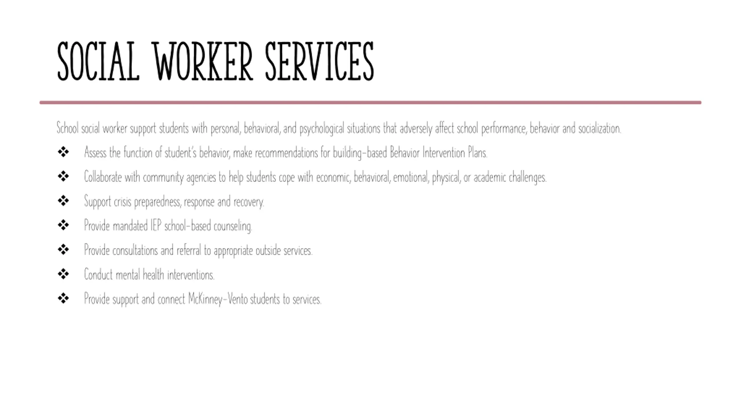 Social Worker services School social worker support students with personal, behavioral, and psychological situations that adversely affect school performance, behavior and socialization. Assess the function of student s behavior, make recommendations for building-based Behavior Intervention Plans. Collaborate with community agencies to help students cope with economic, behavioral, emotional, physical, or academic challenges. Support crisis preparedness, response and recovery. Provide mandated IEP school-based counseling. Provide consultations and referral to appropriateoutside services. Conduct mental health interventions. Provide support and connect McKinney-Vento students toservices.