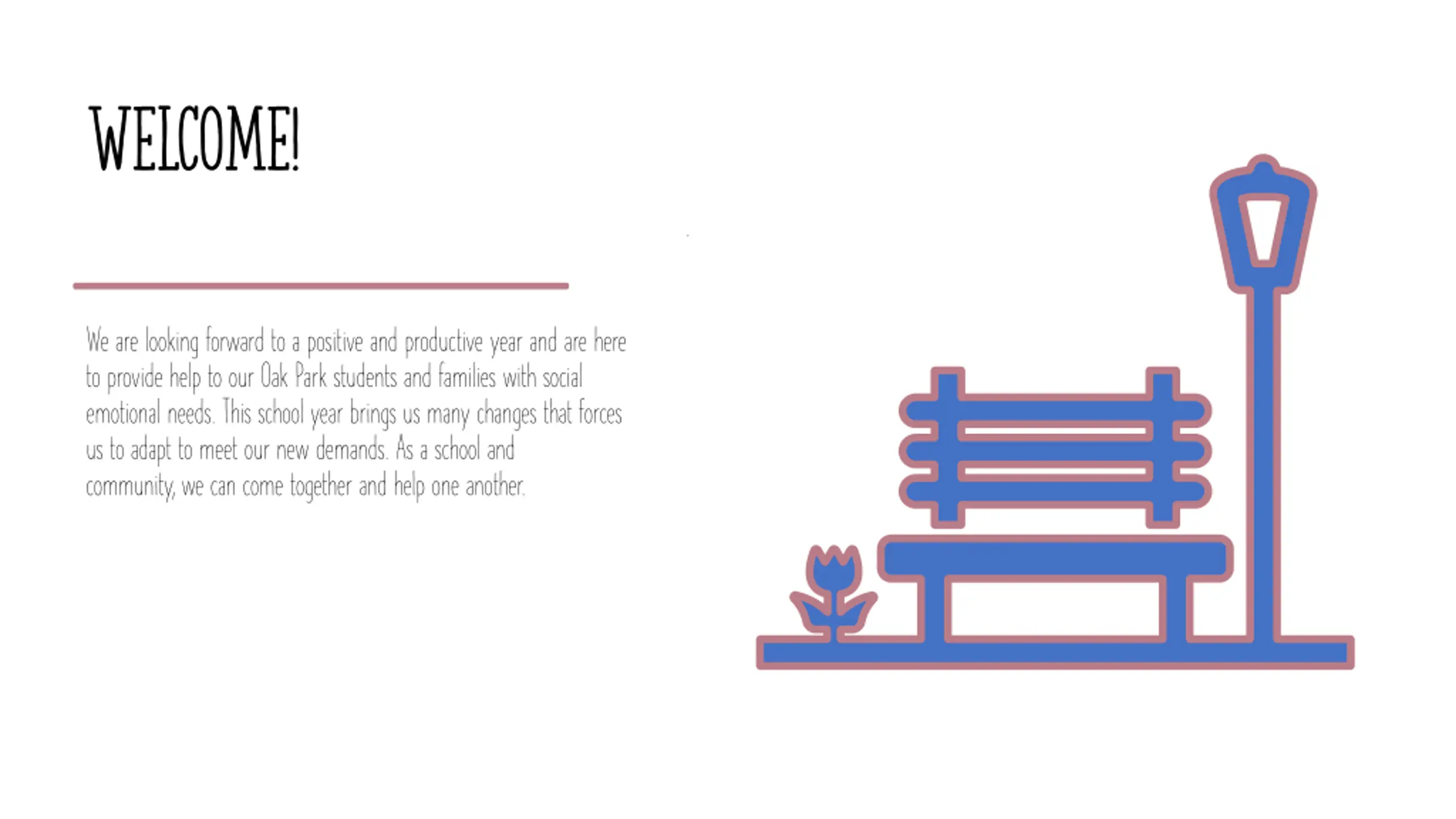 Welcome! We are looking forward to a positive and productive year and are here to provide help to our Oak Park students and families with social emotional needs. This school year brings us many changes that forces us to adapt to meet our new demands. As a school and community, we can come together and help one another.