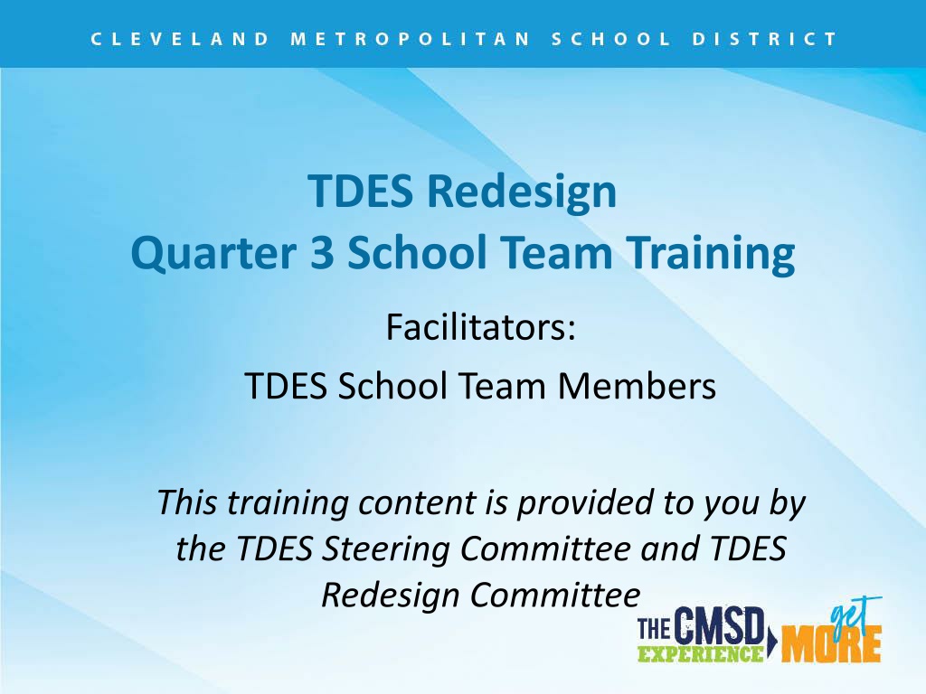 TDES Redesign Quarter 3 School Team Training Facilitators: TDES School Team Members This training content is provided to you by the TDES Steering Committee and TDES Redesign Committee
