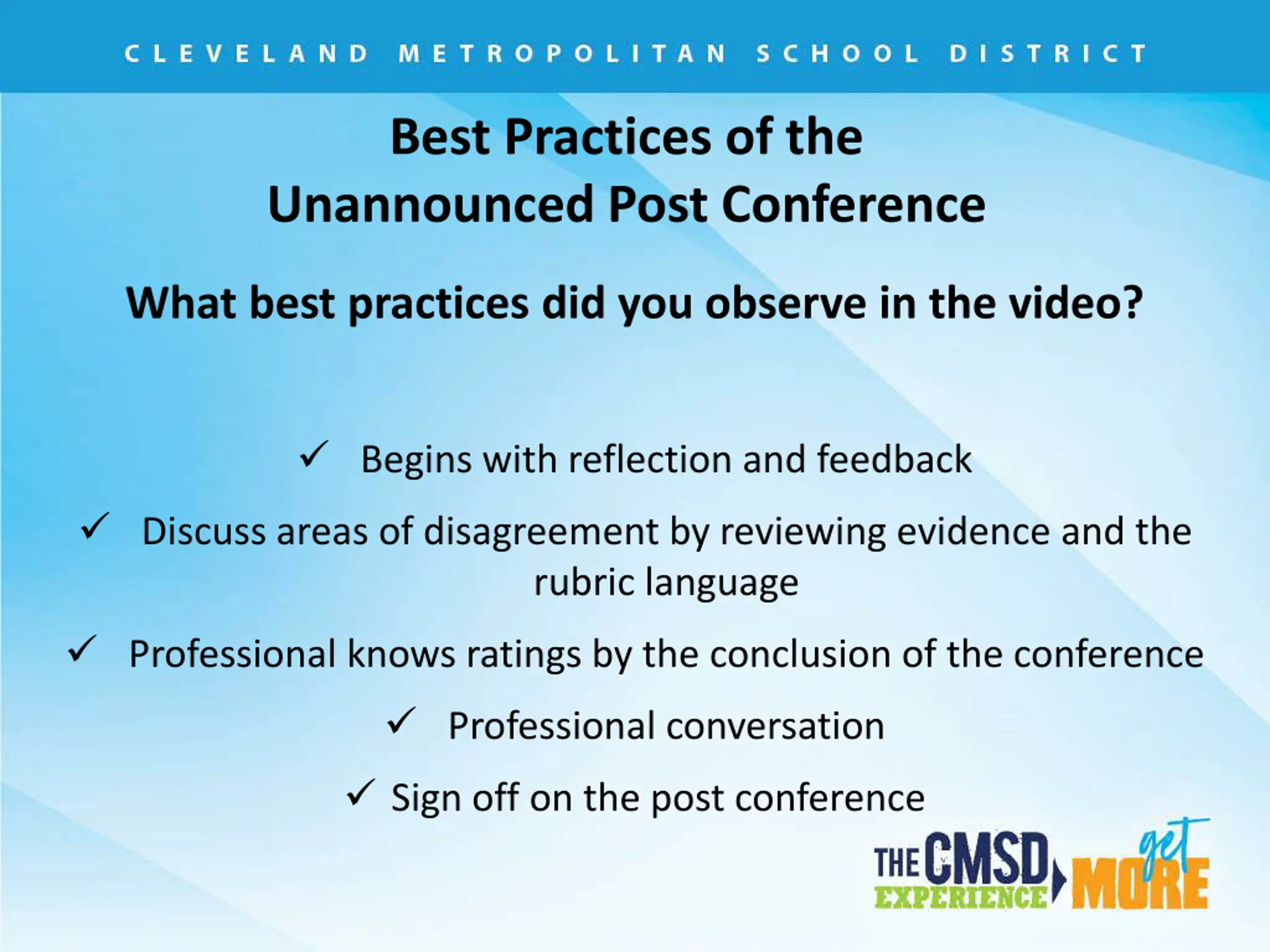 Best Practices of the Unannounced Post Conference What best practices did you observe in the video? Begins with reflection and feedback Discuss areas of disagreement by reviewing evidence and the rubric language Professional knows ratings by the conclusion of the conference Professional conversation Sign off on the post conference