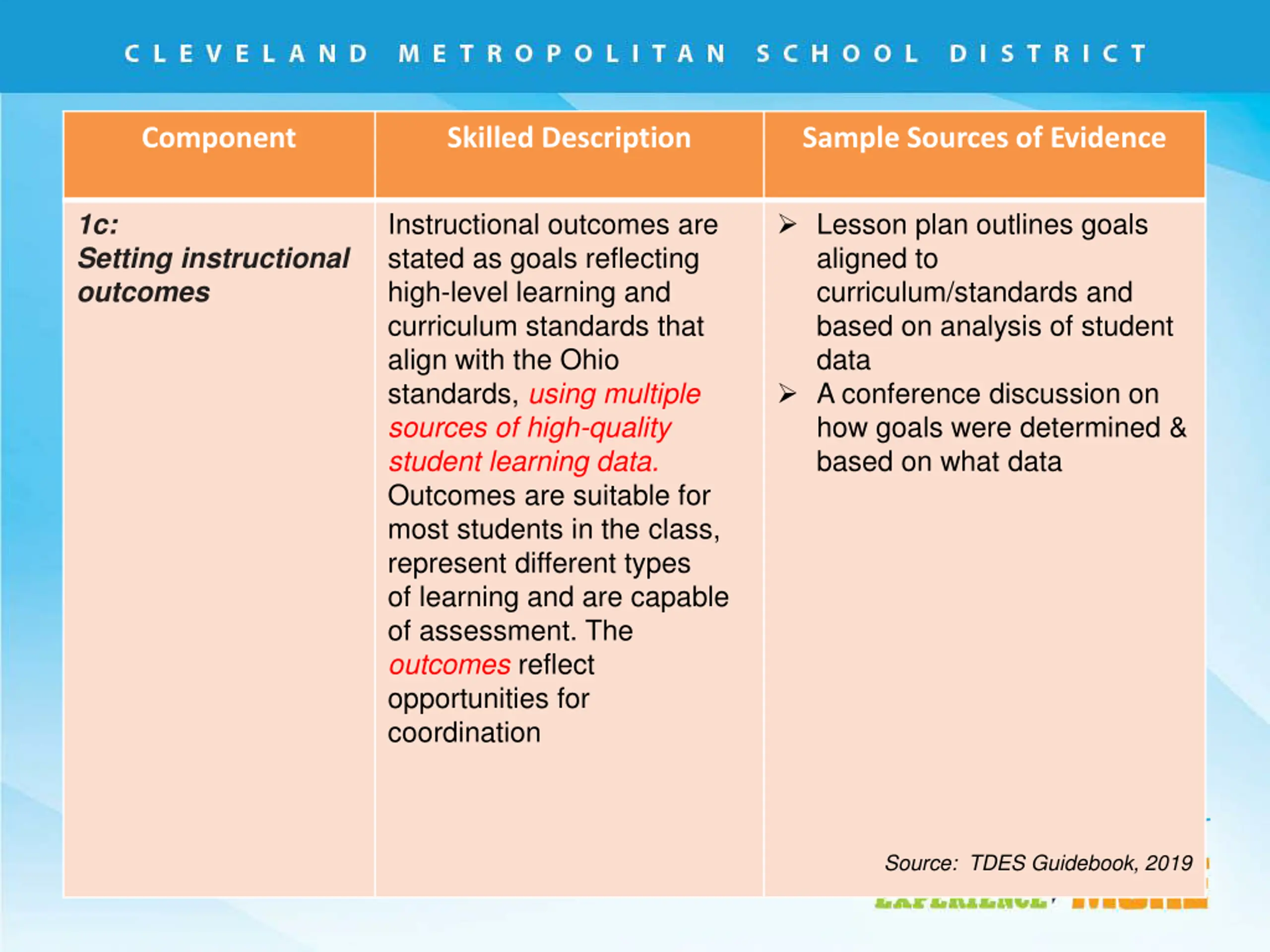 Component Skilled Description Sample Sources of Evidence 1c: Setting instructional outcomes Instructional outcomes are stated as goals reflecting high-level learning and curriculum standards that align with the Ohio standards, using multiple sources of high-quality student learning data. Outcomes are suitable for most students in the class, represent different types of learning and are capable of assessment. The outcomes reflect opportunities for coordination Lesson plan outlines goals aligned to curriculum/standards and based on analysis of student data A conference discussion on how goals were determined & based on what data Source: TDES Guidebook, 2019