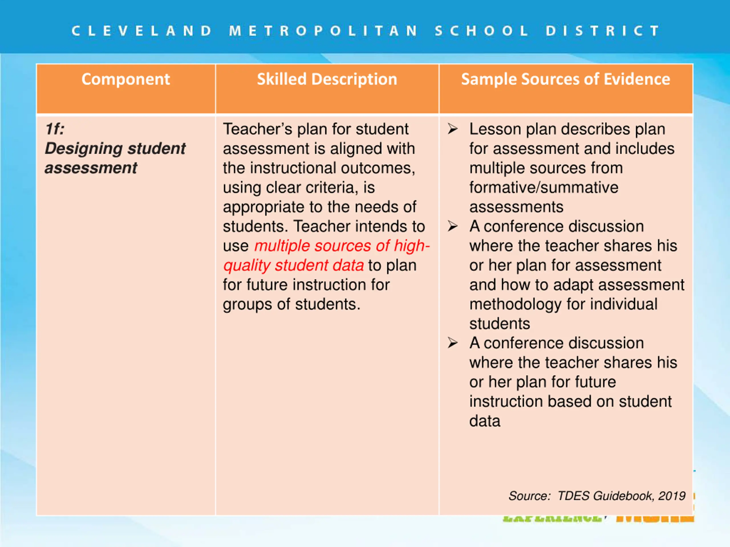Component Skilled Description Sample Sources of Evidence 1f: Designing student assessment Lesson plan describes plan for assessment and includes multiple sources from formative/summative assessments A conference discussion where the teacher shares his or her plan for assessment and how to adapt assessment methodology for individual students A conference discussion where the teacher shares his or her plan for future instruction based on student data Teacher s plan for student assessment is aligned with the instructional outcomes, using clear criteria, is appropriate to the needs of students. Teacher intends to use multiple sources of high- quality student data to plan for future instruction for groups of students. Source: TDES Guidebook, 2019
