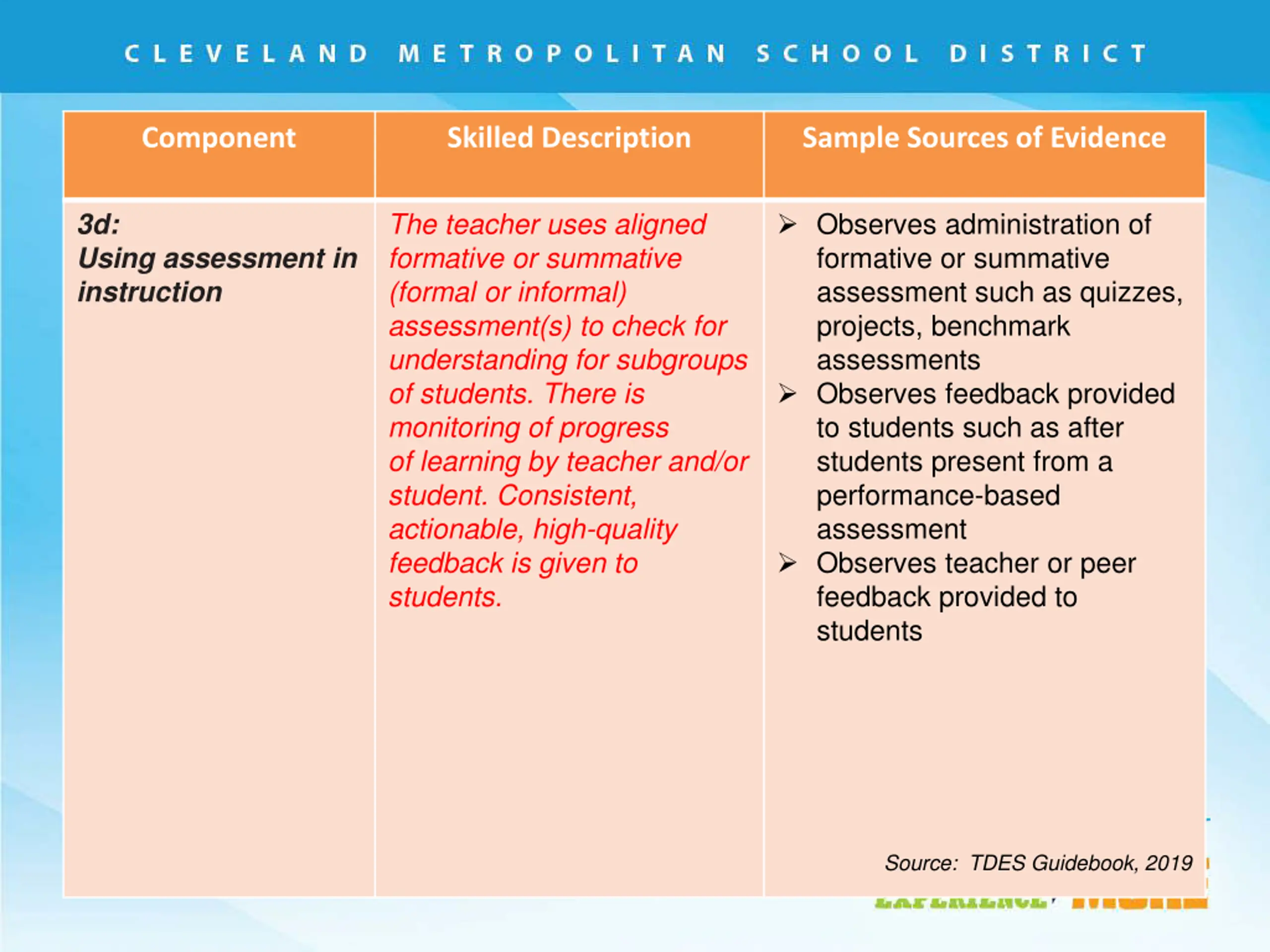 Component Skilled Description Sample Sources of Evidence 3d: Using assessment in instruction The teacher uses aligned formative or summative (formal or informal) assessment(s) to check for understanding for subgroups of students. There is monitoring of progress of learning by teacher and/or student. Consistent, actionable, high-quality feedback is given to students. Observes administration of formative or summative assessment such as quizzes, projects, benchmark assessments Observes feedback provided to students such as after students present from a performance-based assessment Observes teacher or peer feedback provided to students Source: TDES Guidebook, 2019