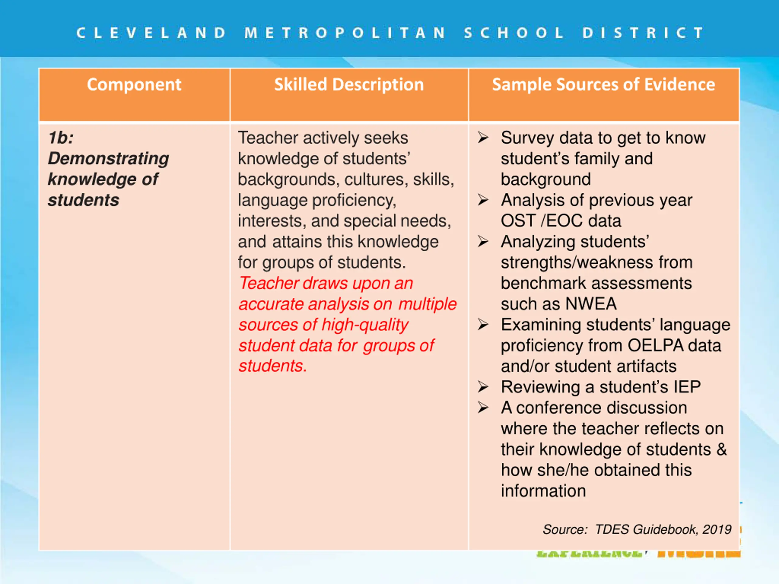 Component Skilled Description Sample Sources of Evidence 1b: Demonstrating knowledge of students Teacher actively seeks knowledge of students backgrounds, cultures, skills, language proficiency, interests, and special needs, and attains this knowledge for groups of students. Teacher draws upon an accurate analysis on multiple sources of high-quality student data for groups of students. Survey data to get to know student s family and background Analysis of previous year OST /EOC data Analyzing students strengths/weakness from benchmark assessments such as NWEA Examining students language proficiency from OELPA data and/or student artifacts Reviewing a student s IEP A conference discussion where the teacher reflects on their knowledge of students & how she/he obtained this information Source: TDES Guidebook, 2019