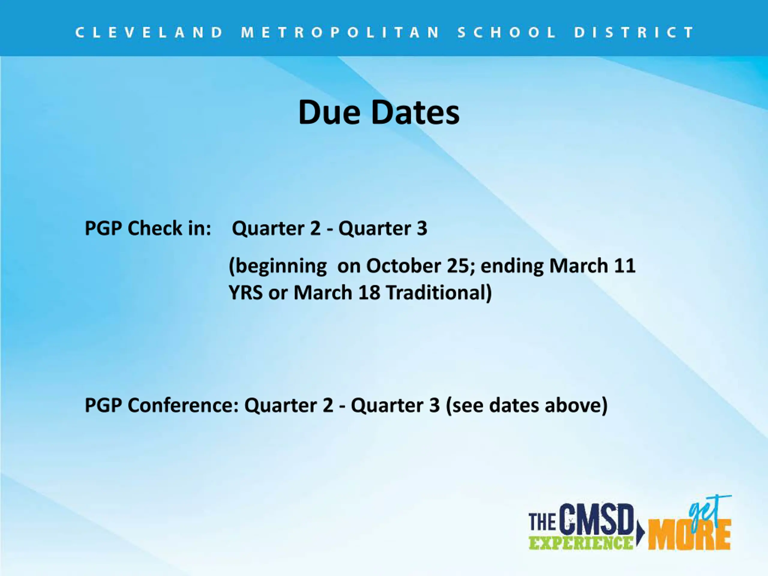 Due Dates PGP Check in: Quarter 2 - Quarter 3 (beginning on October 25; ending March 11 YRS or March 18 Traditional) PGP Conference: Quarter 2 - Quarter 3 (see dates above)