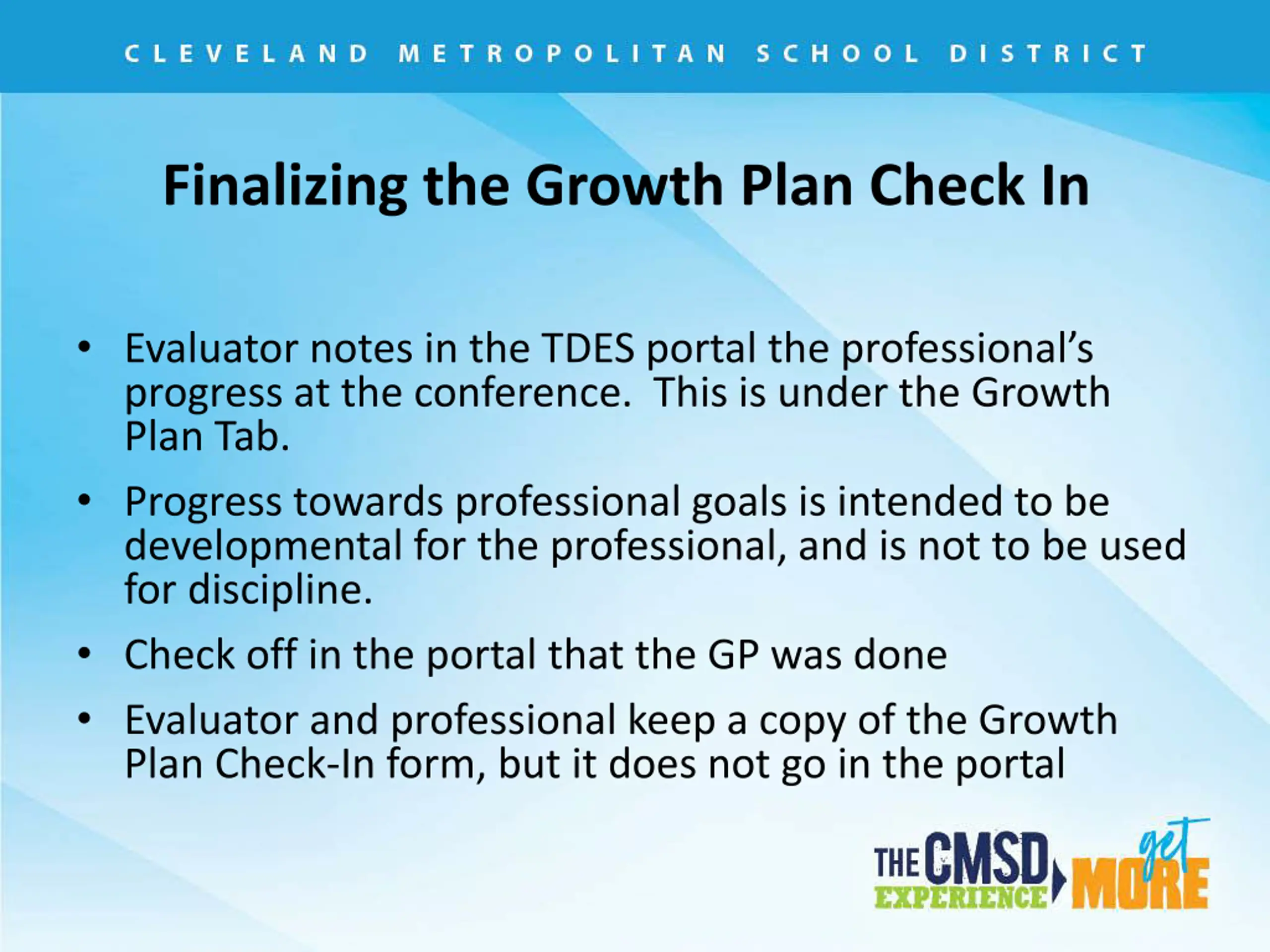 Finalizing the Growth Plan Check In Evaluator notes in the TDES portal the professional s progress at the conference. This is under the Growth Plan Tab. Progress towards professional goals is intended to be developmental for the professional, and is not to be used for discipline. Check off in the portal that the GP was done Evaluator and professional keep a copy of the Growth Plan Check-In form, but it does not go in the portal
