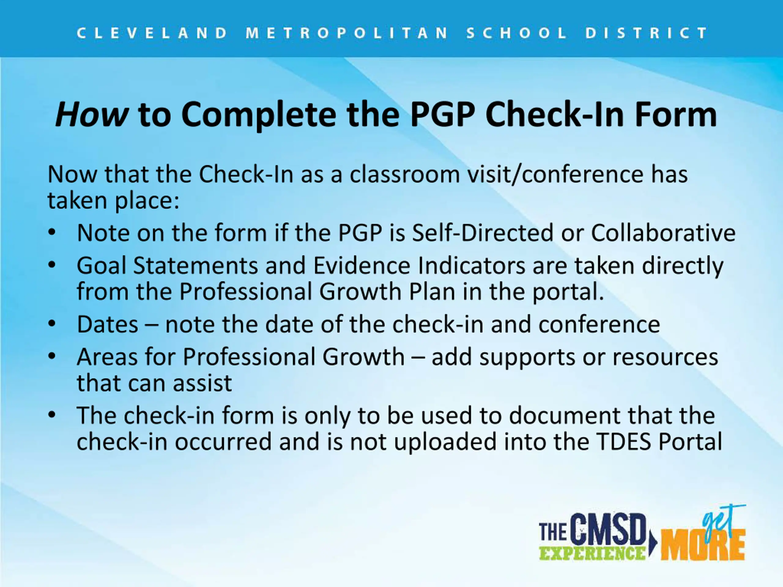How to Complete the PGP Check-In Form Now that the Check-In as a classroom visit/conference has taken place: Note on the form if the PGP is Self-Directed or Collaborative Goal Statements and Evidence Indicators are taken directly from the Professional Growth Plan in the portal. Dates note the date of the check-in and conference Areas for Professional Growth add supports or resources that can assist The check-in form is only to be used to document that the check-in occurred and is not uploaded into the TDES Portal