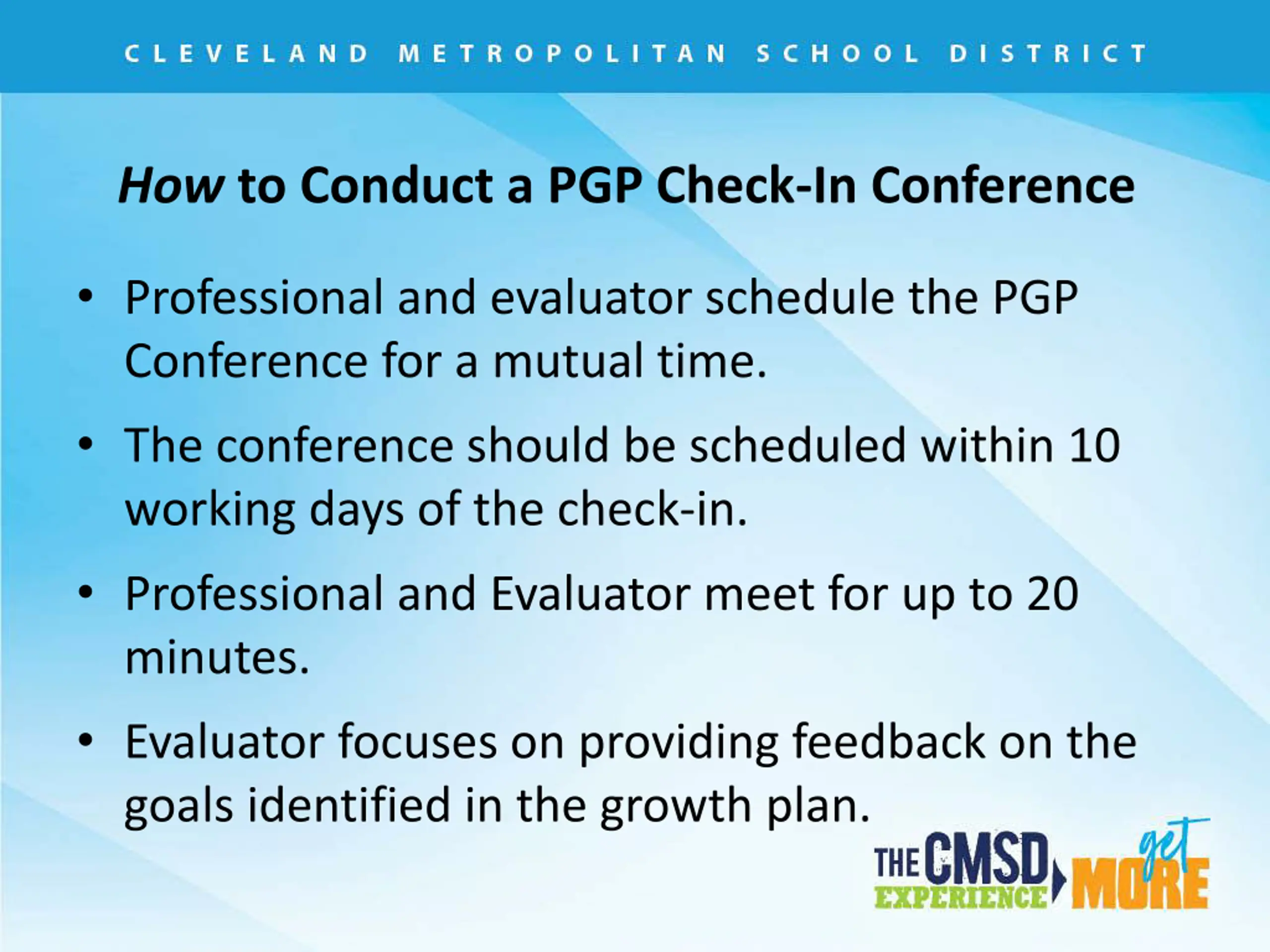 How to Conduct a PGP Check-In Conference Professional and evaluator schedule the PGP Conference for a mutual time. The conference should be scheduled within 10 working days of the check-in. Professional and Evaluator meet for up to 20 minutes. Evaluator focuses on providing feedback on the goals identified in the growth plan.
