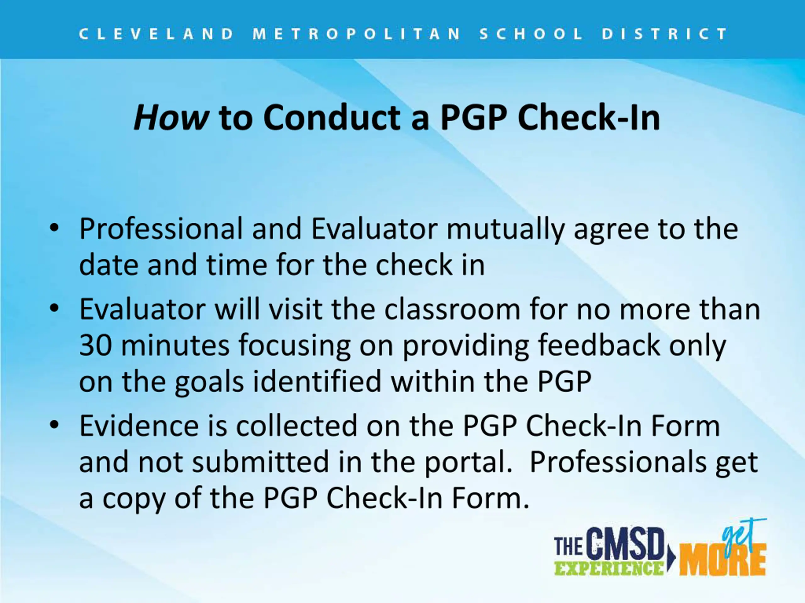 How to Conduct a PGP Check-In Professional and Evaluator mutually agree to the date and time for the check in Evaluator will visit the classroom for no more than 30 minutes focusing on providing feedback only on the goals identified within the PGP Evidence is collected on the PGP Check-In Form and not submitted in the portal. Professionals get a copy of the PGP Check-In Form.