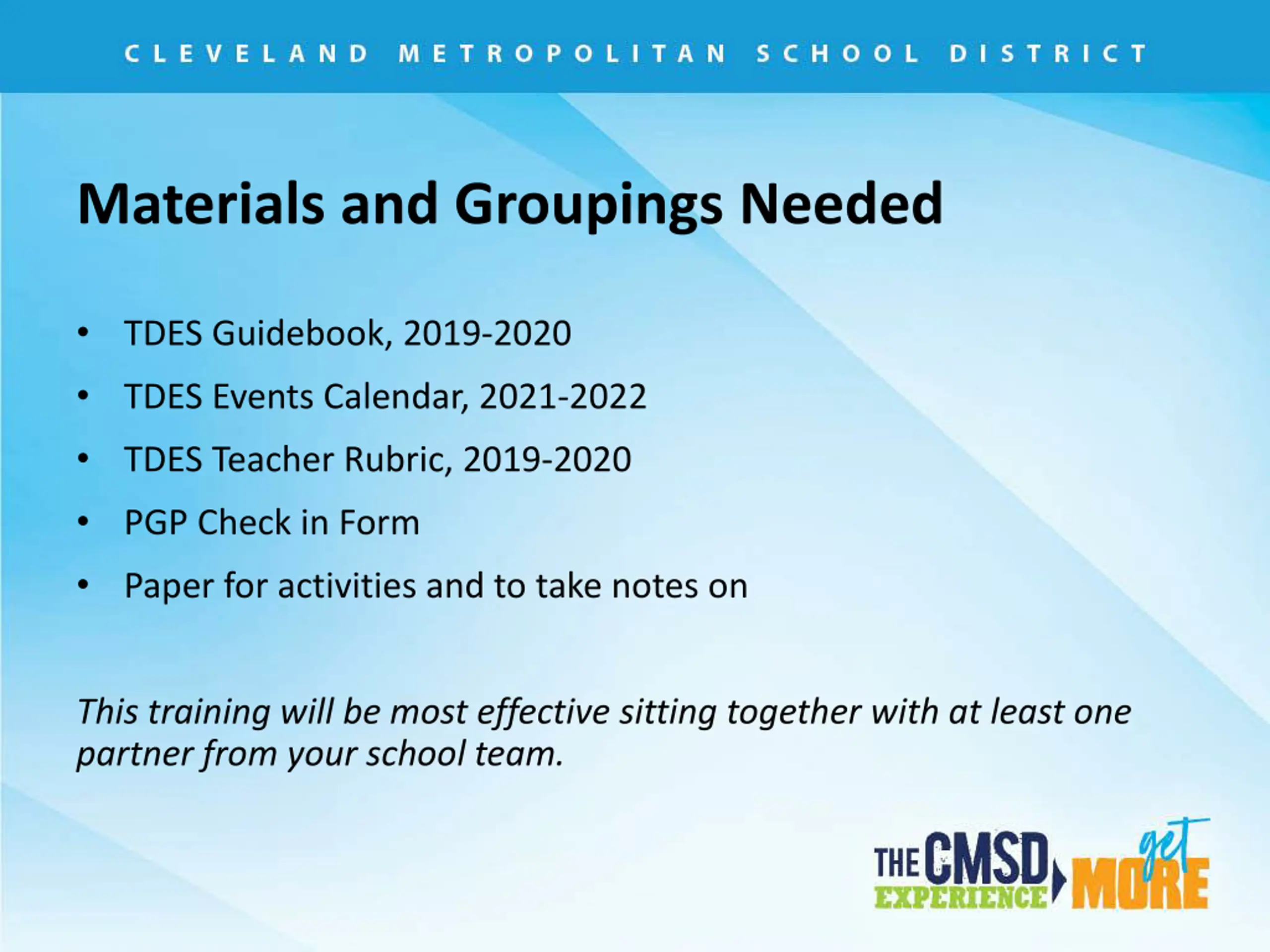 Materials and Groupings Needed TDES Guidebook, 2019-2020 TDES Events Calendar, 2021-2022 TDES Teacher Rubric, 2019-2020 PGP Check in Form Paper for activities and to take notes on This training will be most effective sitting together with at least one partner from your school team.
