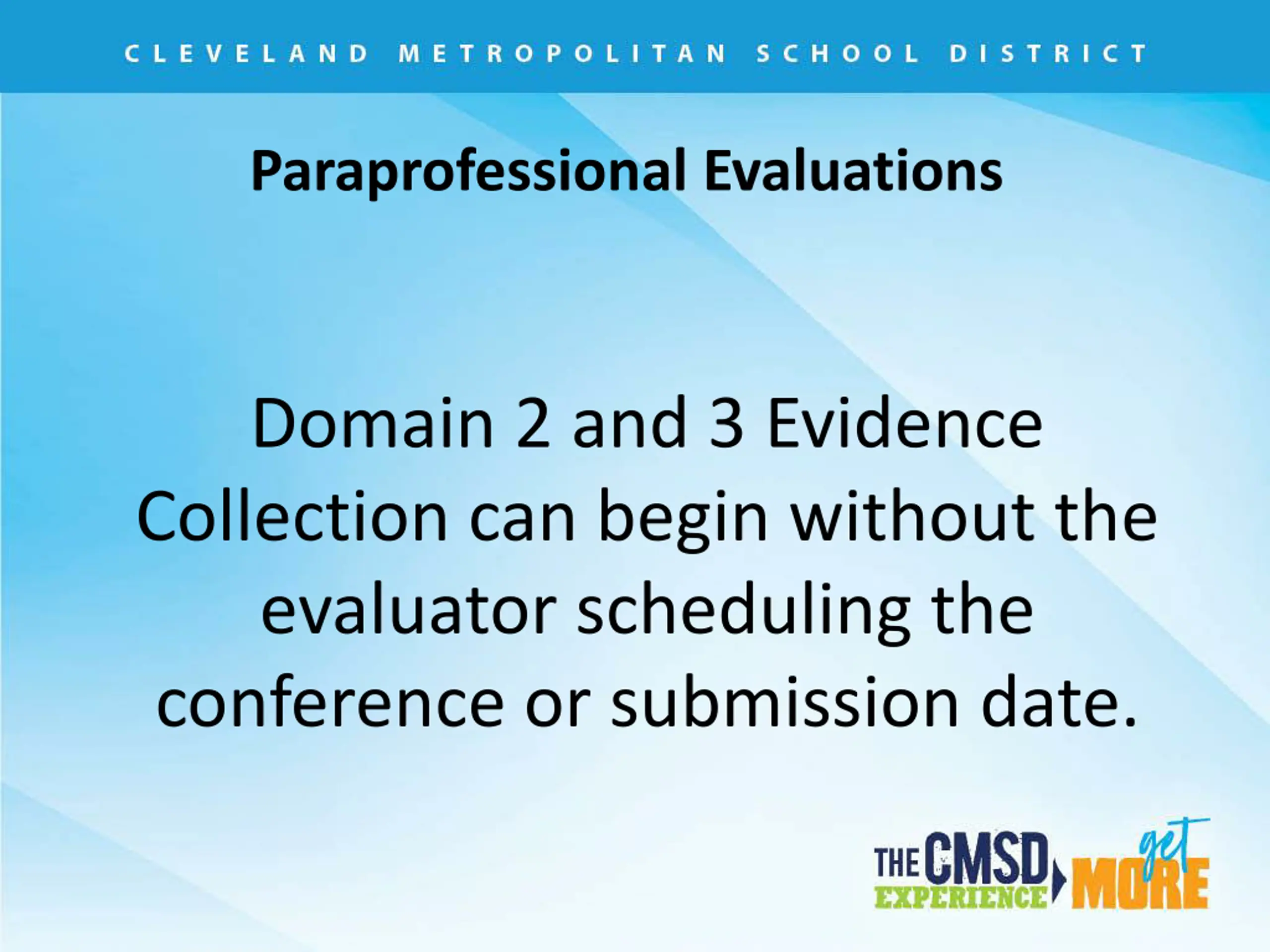 Paraprofessional Evaluations Domain 2 and 3 Evidence Collection can begin without the evaluator scheduling the conference or submission date.