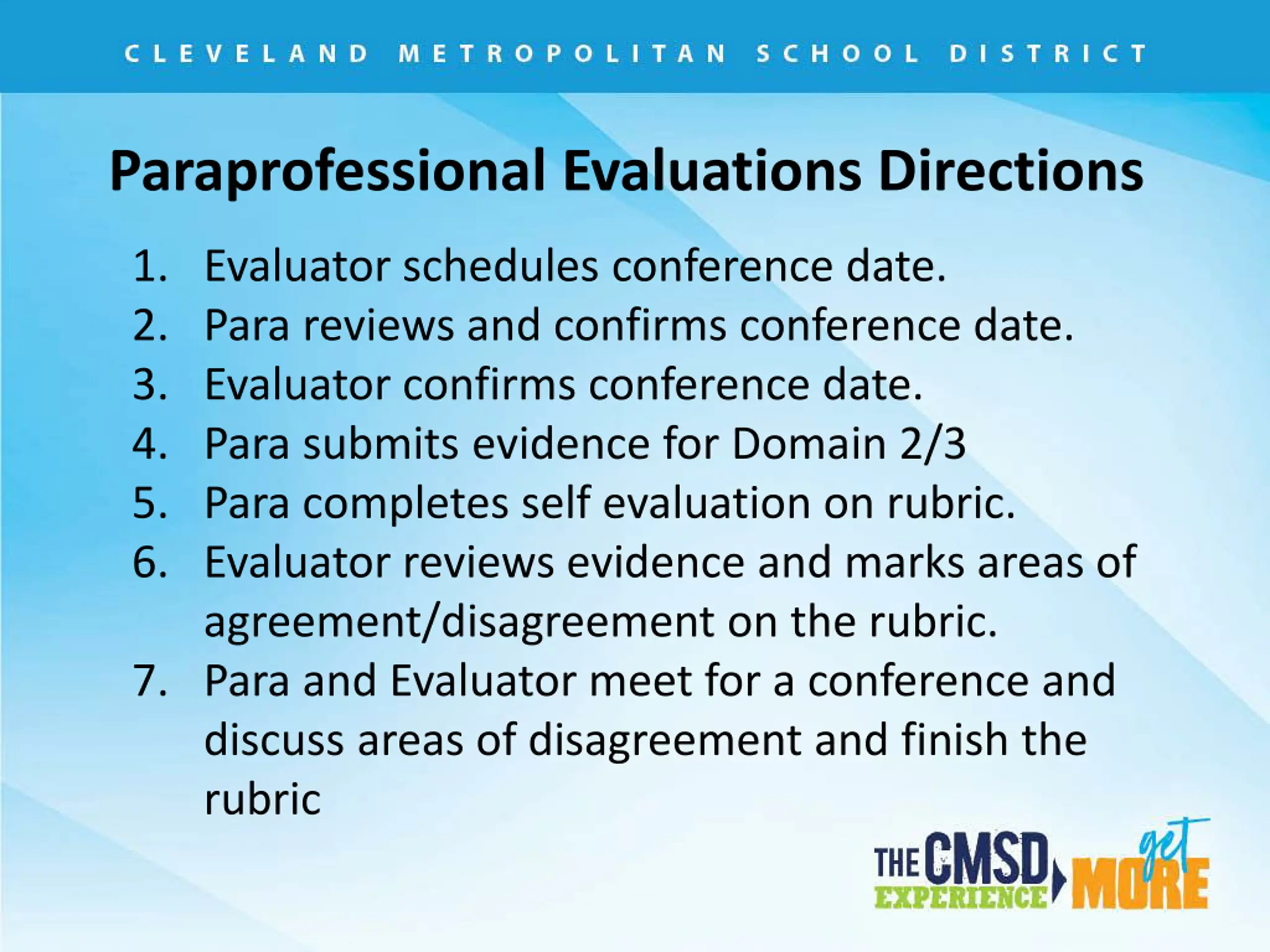 Paraprofessional Evaluations Directions 1. Evaluator schedules conference date. 2. Para reviews and confirms conference date. 3. Evaluator confirms conference date. 4. Para submits evidence for Domain 2/3 5. Para completes self evaluation on rubric. 6. Evaluator reviews evidence and marks areas of agreement/disagreement on the rubric. 7. Para and Evaluator meet for a conference and discuss areas of disagreement and finish the rubric