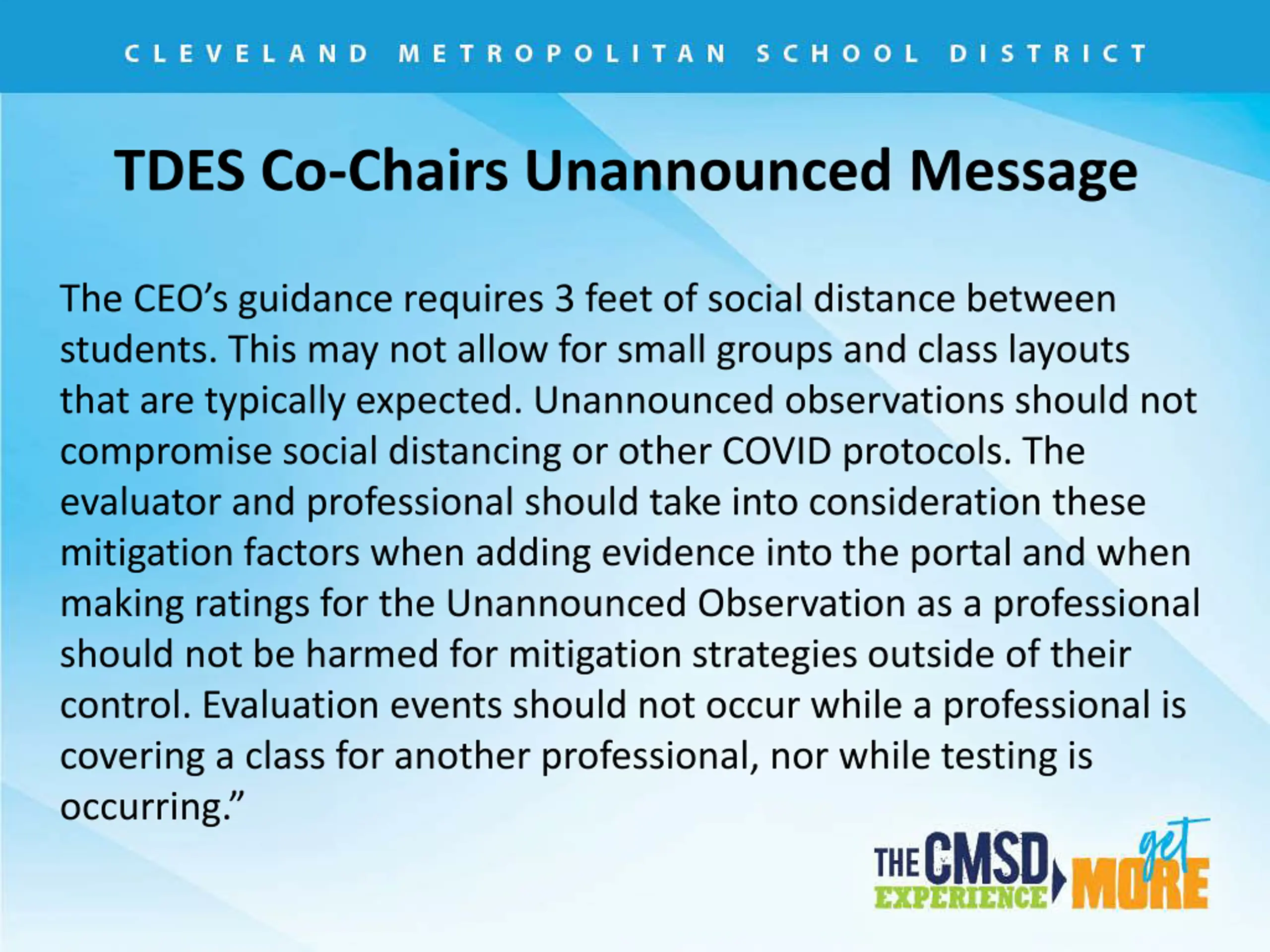 TDES Co-Chairs Unannounced Message The CEO s guidance requires 3 feet of social distance between students. This may not allow for small groups and class layouts that are typically expected. Unannounced observations should not compromise social distancing or other COVID protocols. The evaluator and professional should take into consideration these mitigation factors when adding evidence into the portal and when making ratings for the Unannounced Observation as a professional should not be harmed for mitigation strategies outside of their control. Evaluation events should not occur while a professional is covering a class for another professional, nor while testing is occurring.