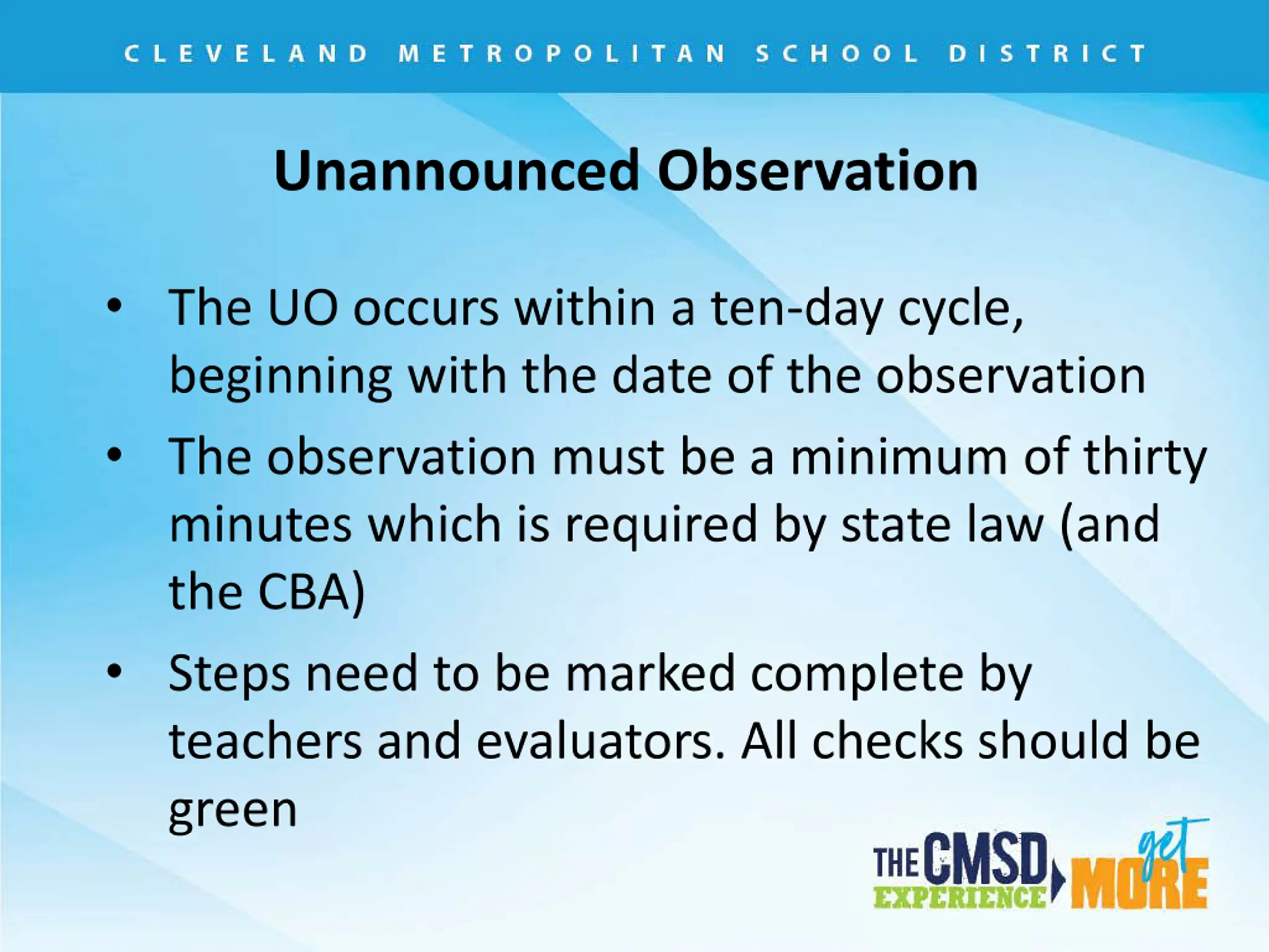 Unannounced Observation The UO occurs within a ten-day cycle, beginning with the date of the observation The observation must be a minimum of thirty minutes which is required by state law (and the CBA) Steps need to be marked complete by teachers and evaluators. All checks should be green