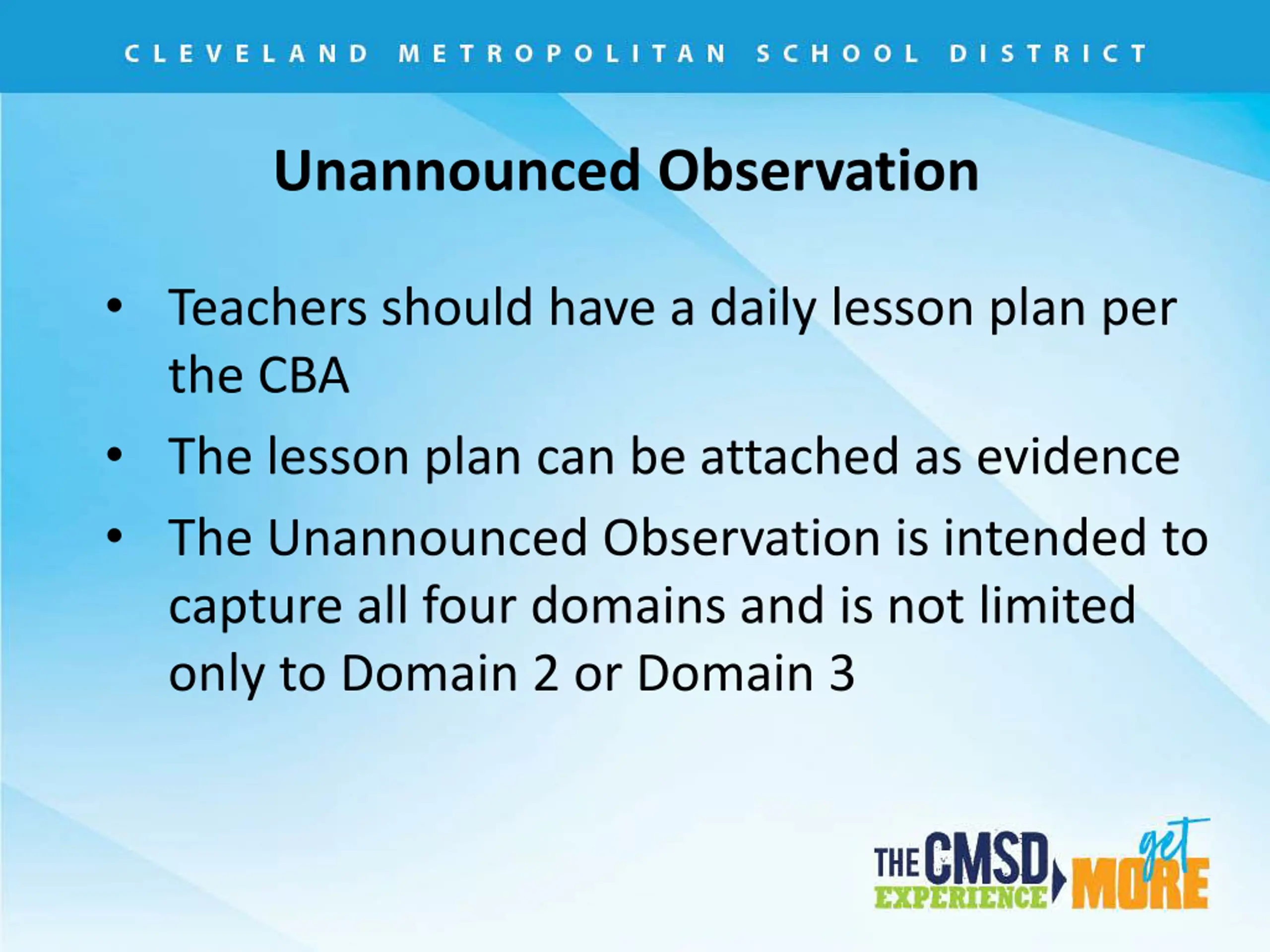 Unannounced Observation Teachers should have a daily lesson plan per the CBA The lesson plan can be attached as evidence The Unannounced Observation is intended to capture all four domains and is not limited only to Domain 2 or Domain 3
