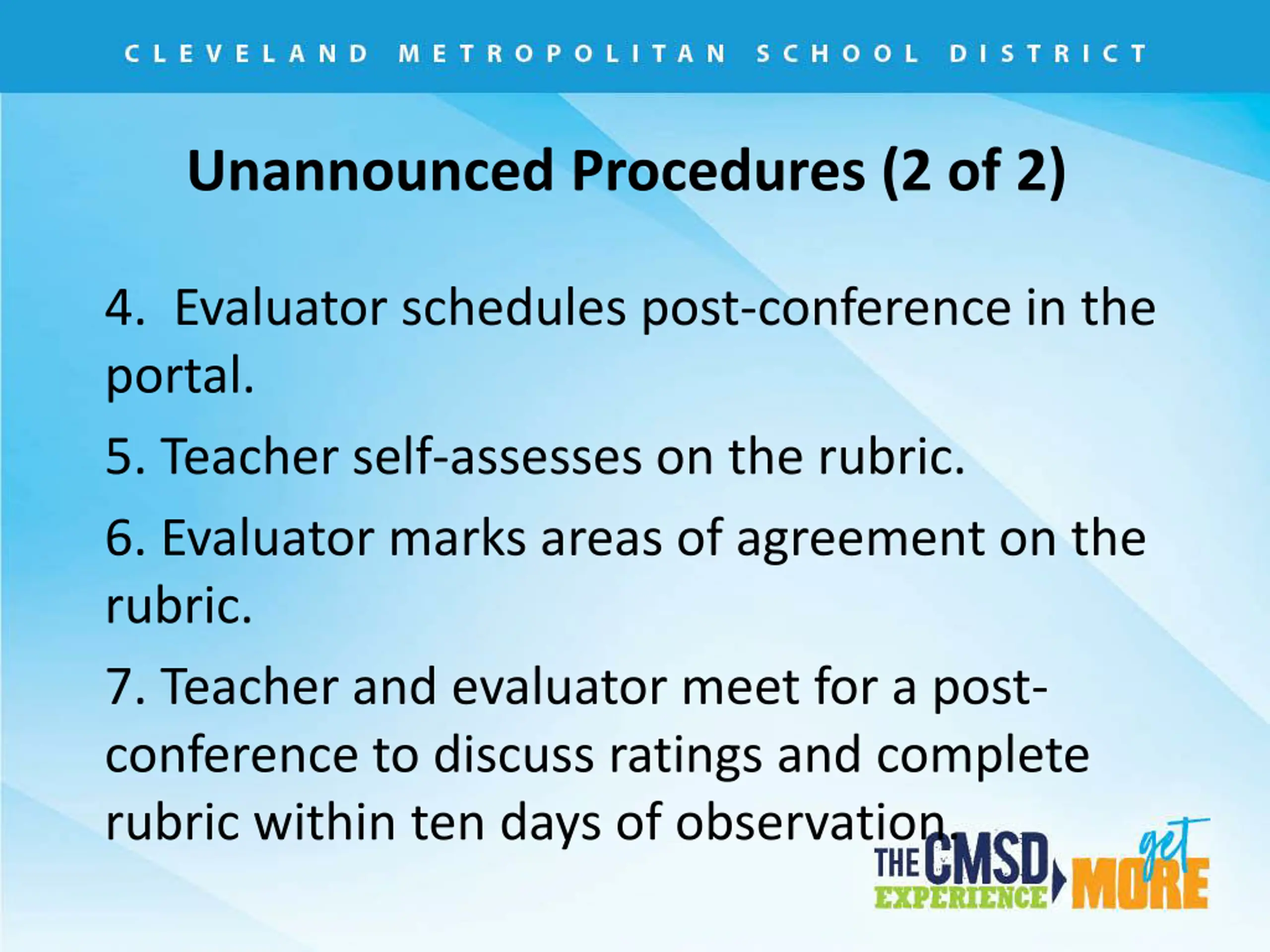Unannounced Procedures (2 of 2) 4. Evaluator schedules post-conference in the portal. 5. Teacher self-assesses on the rubric. 6. Evaluator marks areas of agreement on the rubric. 7. Teacher and evaluator meet for a post- conference to discuss ratings and complete rubric within ten days of observation.