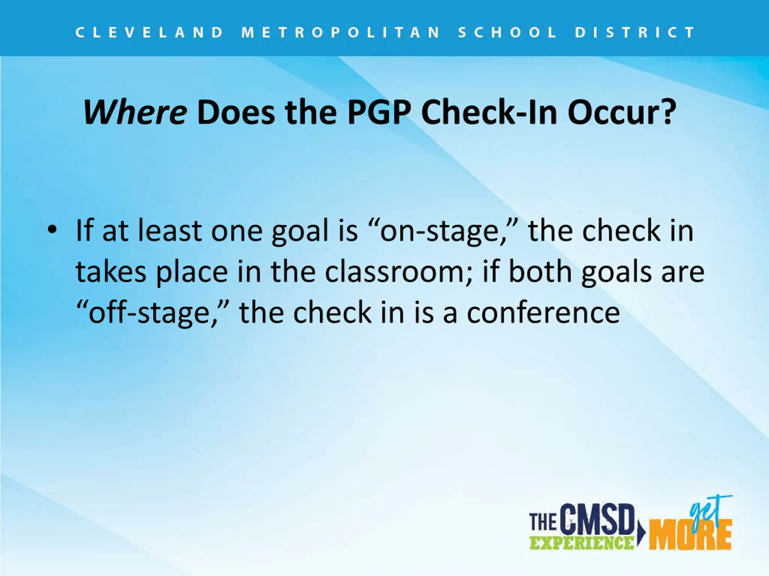 Where Does the PGP Check-In Occur? If at least one goal is on-stage, the check in takes place in the classroom; if both goals are off-stage, the check in is a conference