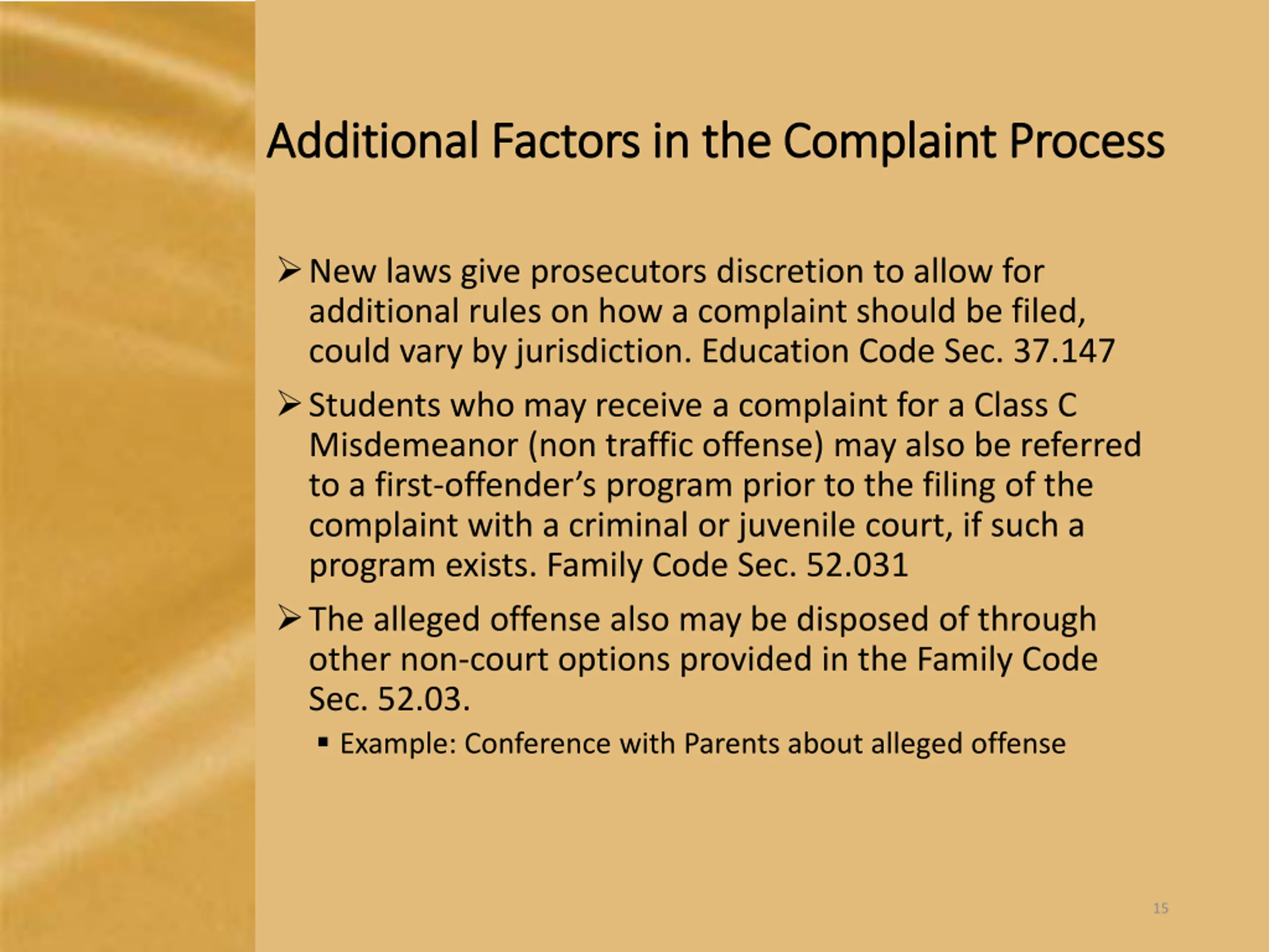 Additional Factors in the Complaint Process Additional Factors in the Complaint Process New laws give prosecutors discretion to allow for additional rules on how a complaint should be filed, could vary by jurisdiction. Education Code Sec. 37.147 Students who may receive a complaint for a Class C Misdemeanor (non traffic offense) may also be referred to a first-offender s program prior to the filing of the complaint with a criminal or juvenile court, if such a program exists. Family Code Sec. 52.031 The alleged offense also may be disposed of through other non-court options provided in the Family Code Sec. 52.03. Example: Conference with Parents about alleged offense 15
